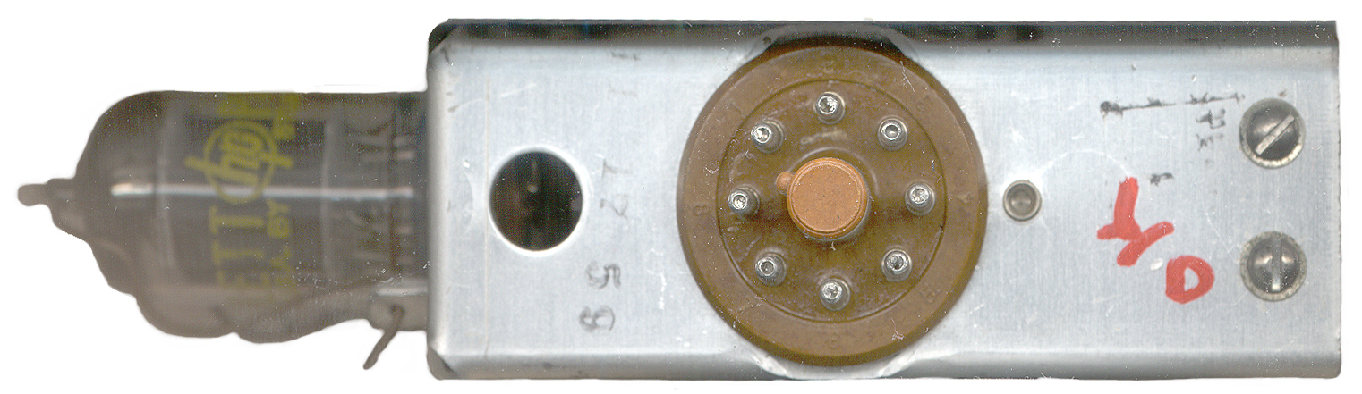 The bottom of the module has a standard 8 pin octal tube base and so the main 521A counter chassis just uses a standard tube sockets for the modules. This particular module has a date stamp of 11 17 59. The manual suggests that other manufacturers also made a plug and play compatible counter module.