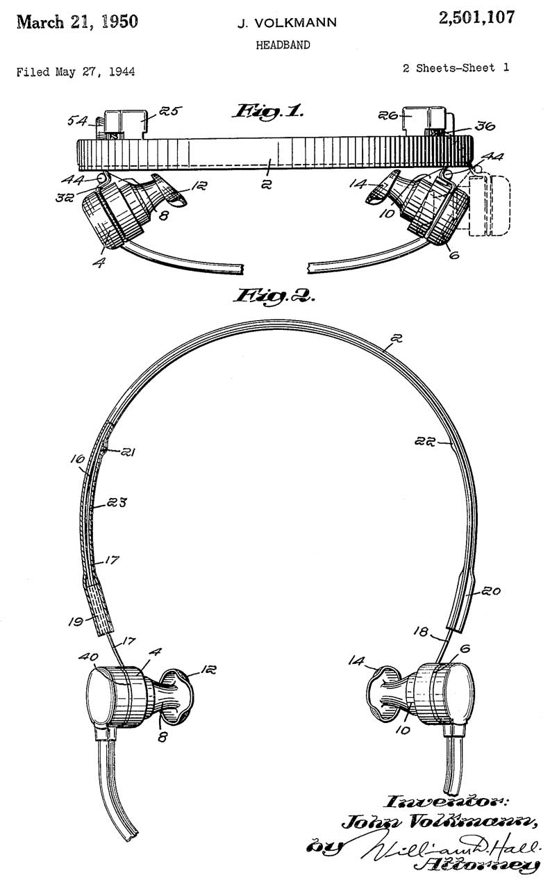 2584402 Acoustic coupler for earphones, Volkmann John, OSRD (Wiki), App: 1944-06-05, W.W.II, Pub: 1952-02-05, -