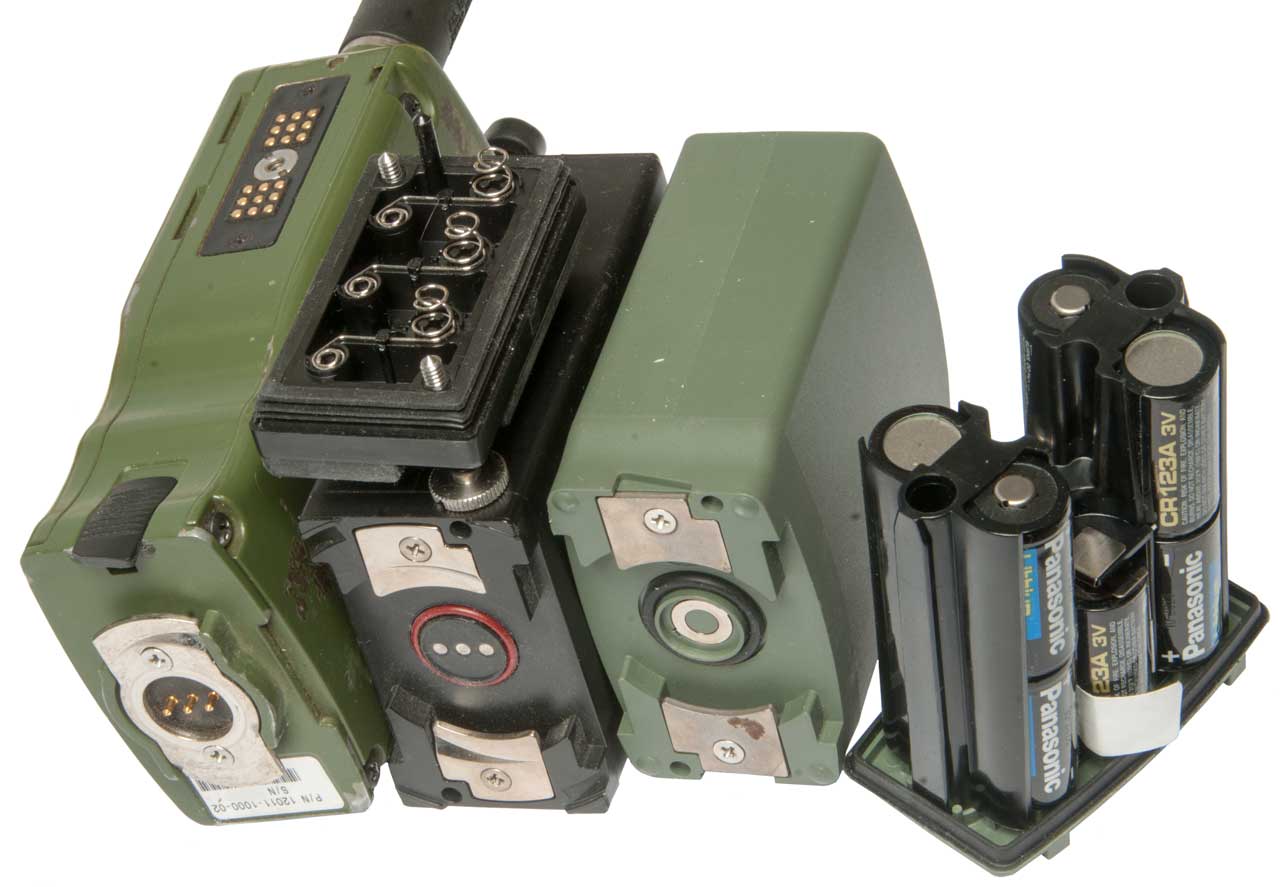 Thales 4101240-500 holds 12 ea CR123 batteries = 36 VDC (rubber on bottom)