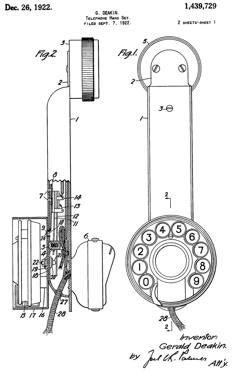 1439729 Telephone hand set, Deakin Gerald, AT&T, 1922-12-26, 379/362; D14/148; 379/370; 379/433.07; 379/433.01 - Belgium may use different dial number order?