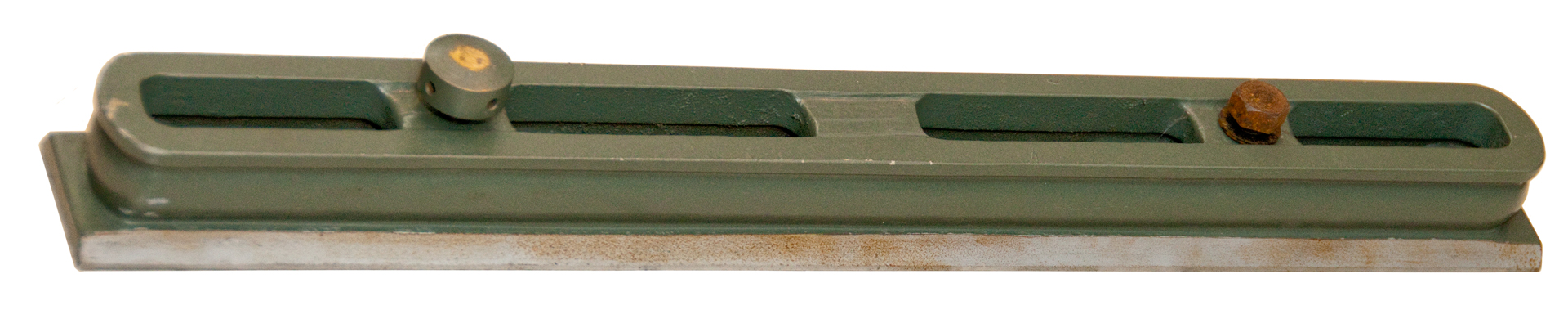 Description: The spectrometer is mounted on a machined cast iron base with dovetail groves for mounting accessories. A control box is linked to the spectrometer, which has a filar eyepiece. The knob on the control box was used to rotate the spectrometer's prism, since its collimator and telescope are held fixed at all times. There is a precision scale to read the wavelength, with a magnifier for reading the scale. The spectrometer has an adjustable slit with a micrometer adjustment to control the slit width. There is a small transformer with electrical cord terminating in a standard 3-prong AC plug."