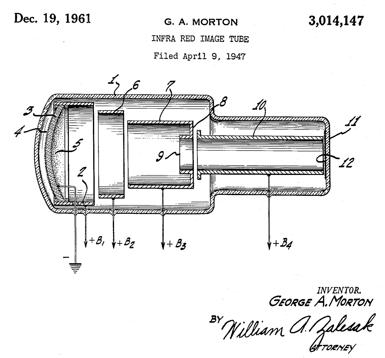 3624400 Apparatus for the production of high-resolution visible images of objects illuminated by or emitting infrared radiation, Barry George Cohen, American Optical, 1971-11-30, - 1.15, 1.06 or 1.2 micron IR, not thermal.
