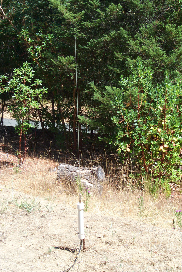 (top of page) Antenna mounted at ground level using a wood stake and plastic tie wraps so as to not add any extra capacitance to ground. The whip is a Radio Shack 1 meter 21-952A Mobile CB Antenna Stainless Steel Replacement Whip with a male 1/4-20 thread base. I added a 4' ground stake right at the antenna base while trying to improve the noise floor, but it did not make a noticeable improvement. Although the antenna is mounted near the ground it is on the edge of a slope and is also relatively in the clear above, tree wise.Spectrum Plots made with the AMRAD antenna: