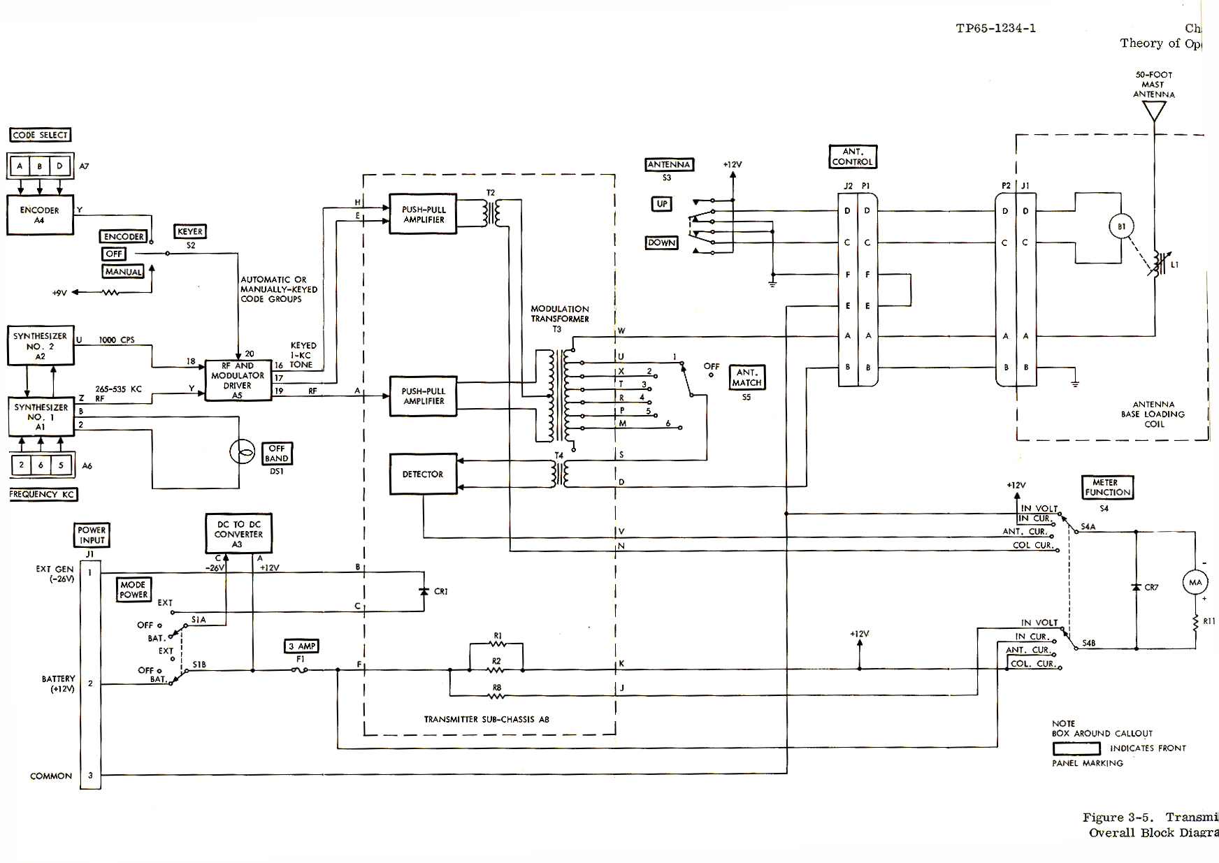 The J1 Pin assignment seems to be:1 = -26 Volts - There is a -26 V to +12 Volt Dc to Dc converter in the transmitter.