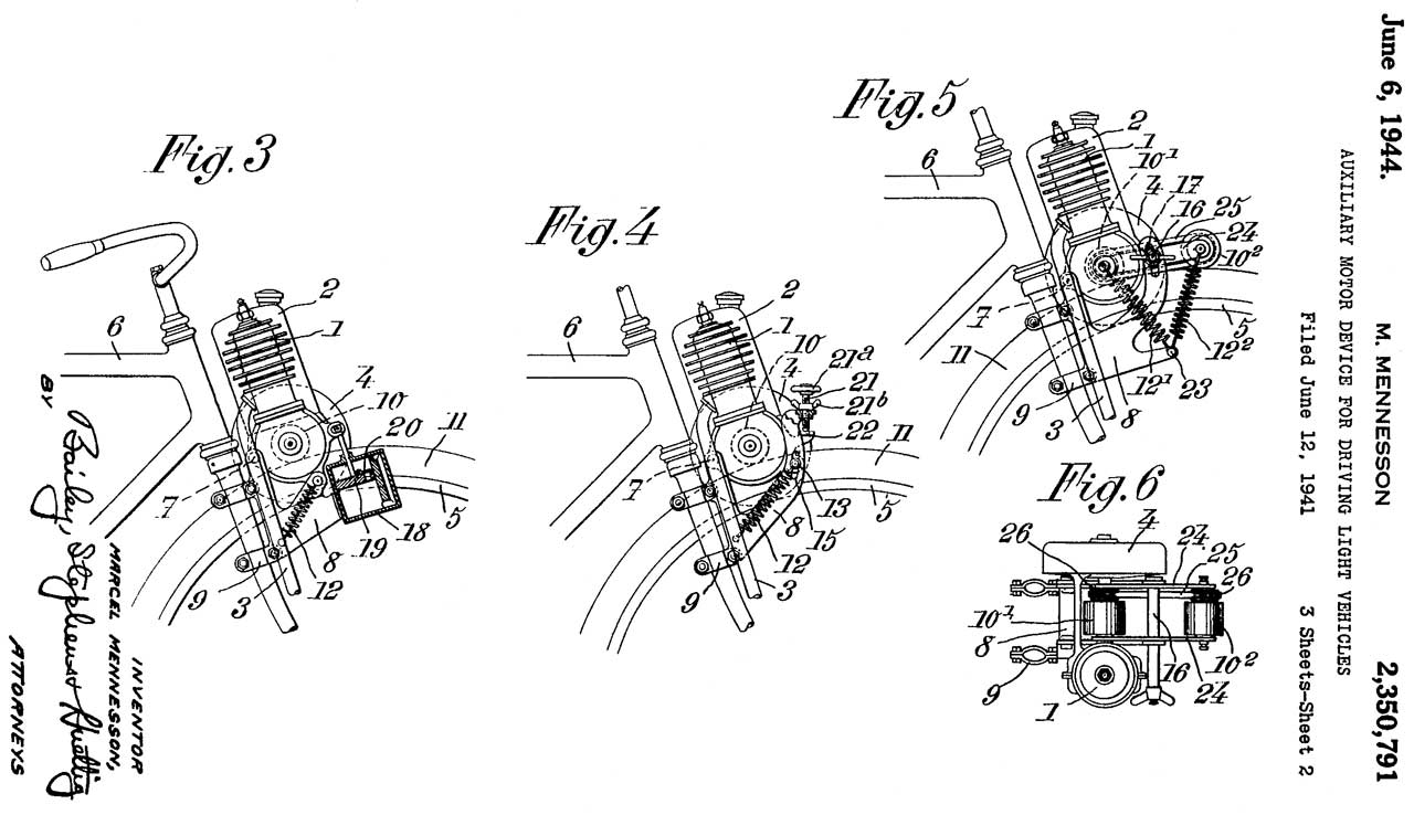 2350791 Auxiliary motor device for driving light vehicles, Mennesson Marcel, App: 1941-06-12, W.W.II, Pub: 1944-06-06, - Solex motorbike