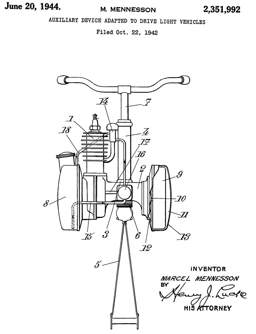 2351992 Auxiliary device adapted to drive light vehicles, Mennesson Marcel, App: 1942-10-22, W.W.II, Pub: 1944-06-20, - Solex motorbike