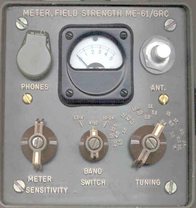 The U.S. military has many Field Strength Meters. These are used for a number of purposes, but the key one is to tune up radios after they are configured on a new frequency. Ham radio operators use a VSWR meter, but that is not possible on many military radios since the antenna attaches directly to the radio, i.e. there is no place that in the antenna system that's 50 Ohms.The "PHONES" jack can by used to hear an AM version of the signal being received by the ME-61. This signal monitor function may be done at the transmitter location in cases where the transmit antenna is located some distance away to confirm that a signal is getting out.