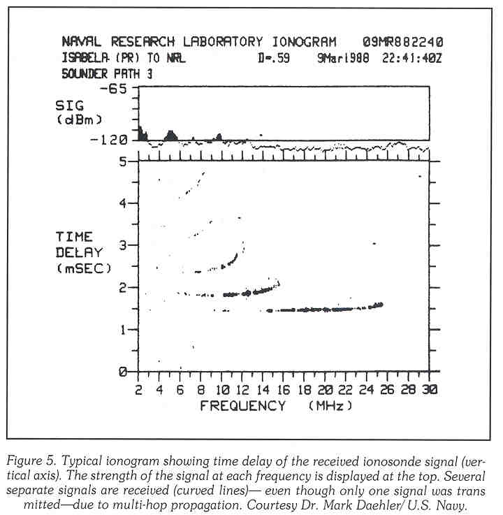 Occasionally, a transmitted signal may reach the receiver along several different paths, each with a different time delay. This is why more than one signal shows up in Figure 5, even though only one was transmitted. The separate signals appear as curved traces in Figure 5, where each trace records the signal's time delay (vertical axis) as a function of frequency (horizontal axis). The signals that have taken many hops to reach the receiver show up at large time delays since they have been traveled a larger total distance. The strength of all the signals combined is shown as a function of frequency at the top of the figure. The ionosonde receiver automatically ignores normal short-wave signals (i.e., those that don't drift at the same rate as the ionosonde).
