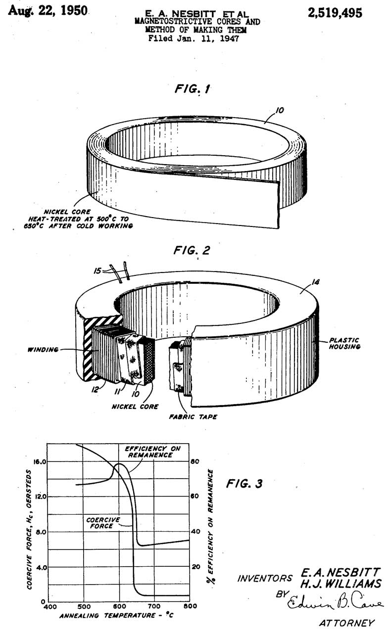 2519495 Magnetostrictive core and method of making it, Ethan A Nesbitt, Howell J Williams, Bell Labs, 1950-08-22, 335/215; 148/312; 148/676; 336/90; 336/213; 148/104; 336/20; 336/110; 336/219 -