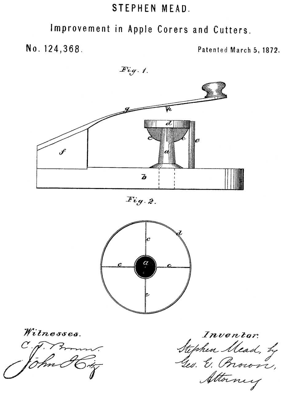 124368 Improvement in Apple Corers and Cutters, Stephen Mead, March 5, 1872, 99/545 116/DIG.12 -