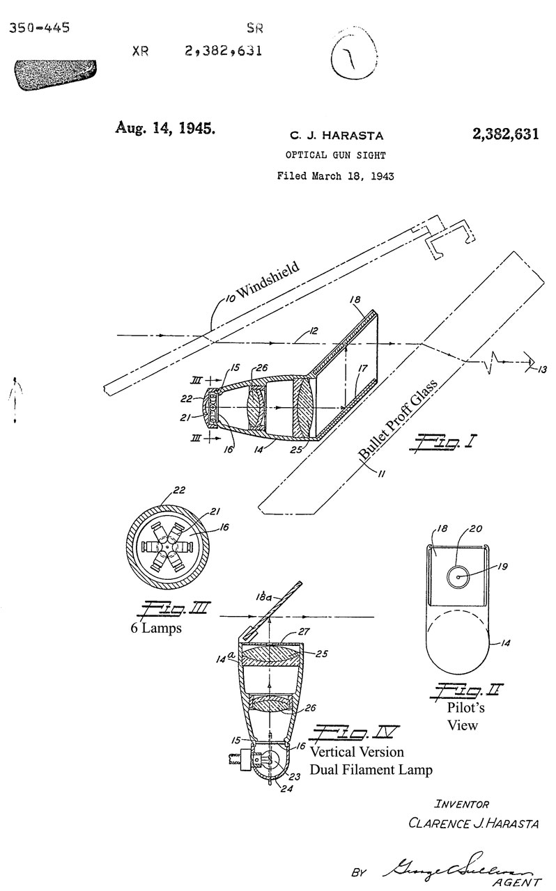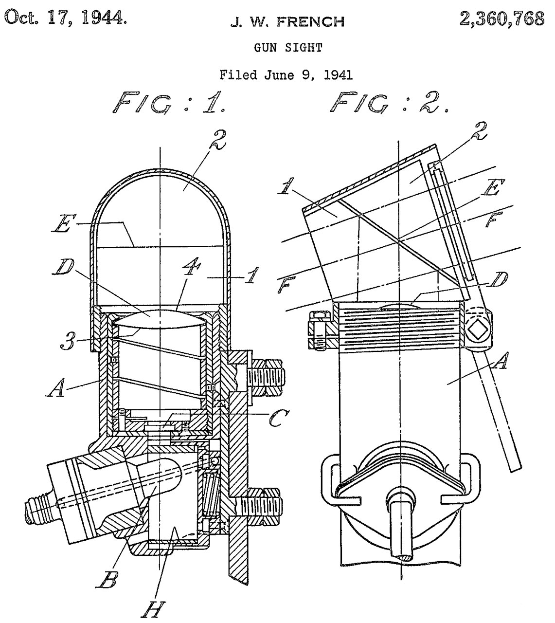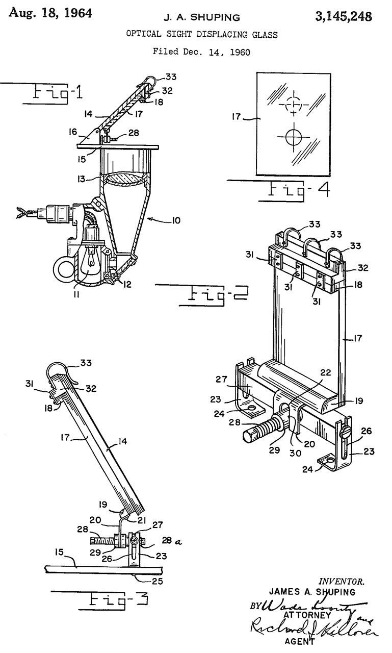 3145248 Optical sight displacing glass, James A Shuping, 1964-08-18 -"... a displacing glass attachment for reflex type optical gun sights to provide such sights with a low altitude bombing capability. "
