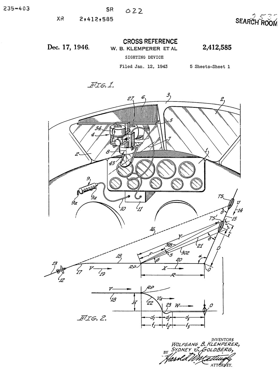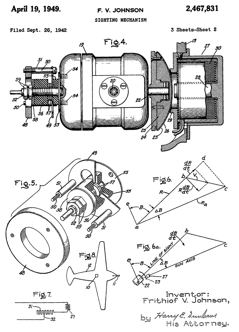 2949808 Aerial gunsight, James E Thurow, Motors Liquidation Co, 1960-08-23 - "The invention has for its principal object to provide a lead predicting type sight head of the above character which is a true spherical, coordinate, angular repeater and yields a spherical, coordinate angle presentation that is free of optical droop errors and does not need any electronic or mechanical compensation." - includes input from RADAR.