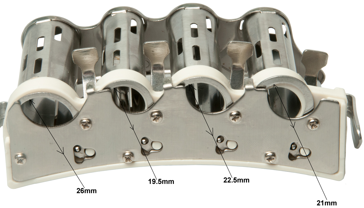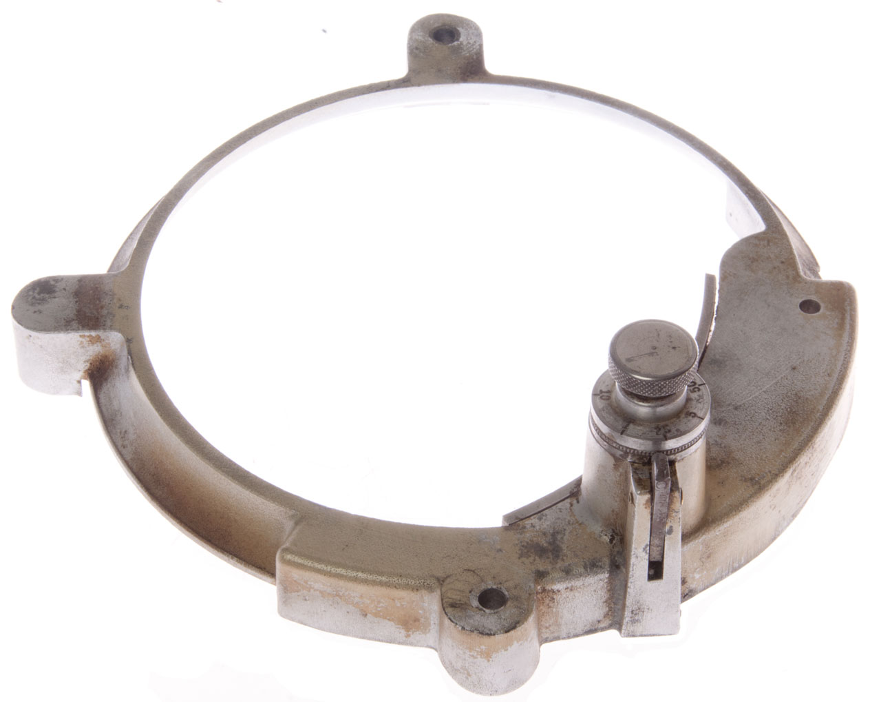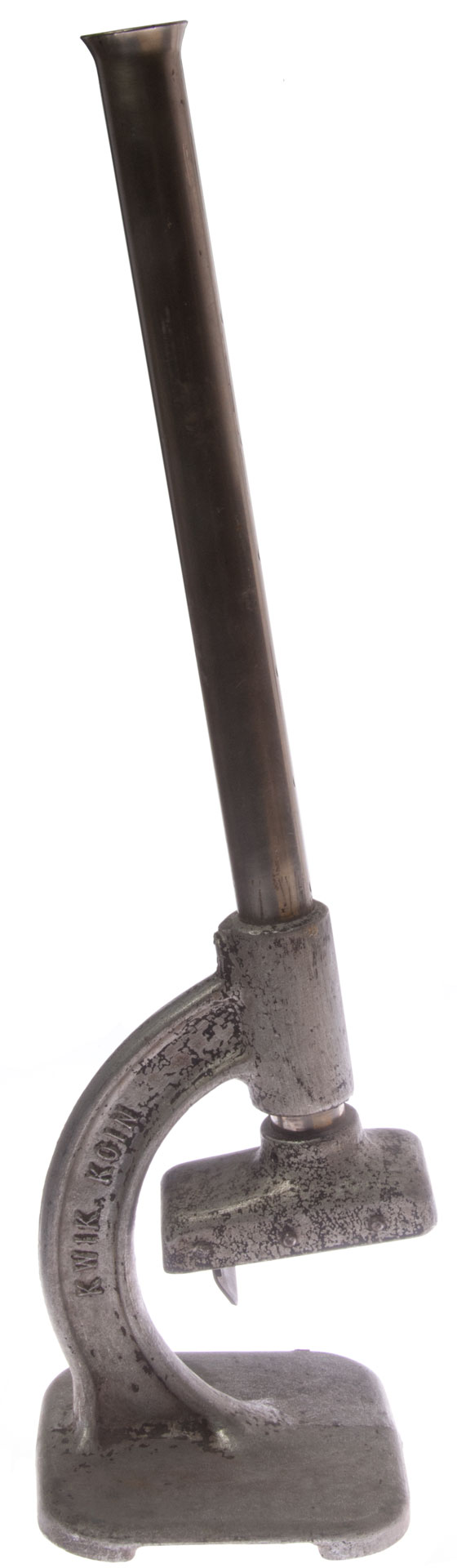 This unit needs to be sitting at the edge of a table if the plastic coin chutes are going to be used since the lower end of the chute is lower than the table top. In Patent 2165240 Fig 4, below you can see that the clamp that holds the coin counter steady on the table also has a stop lever that keeps the coins from falling out of the chute until you are ready to fill a paper roll. That clamp is missing from this machine.