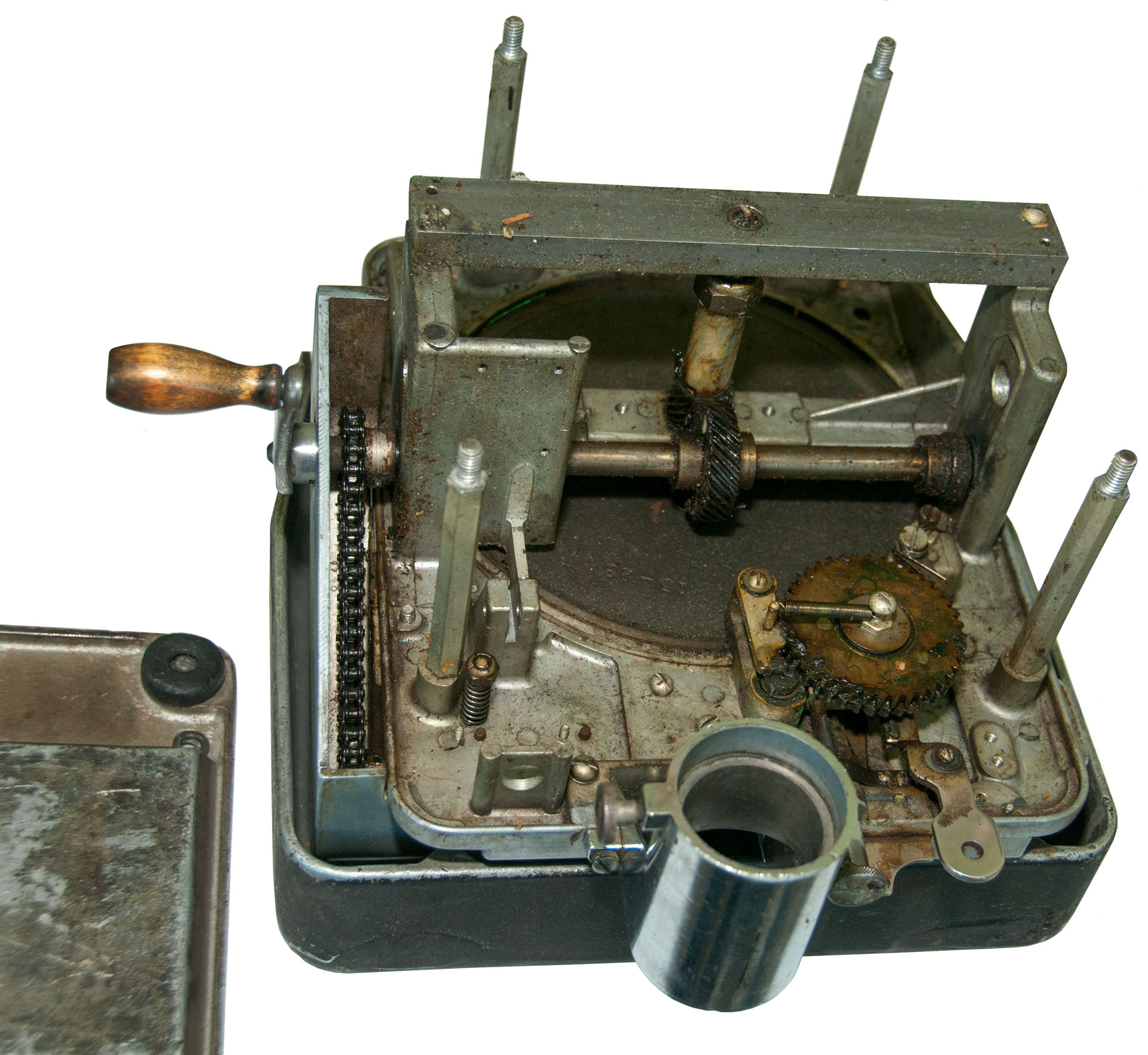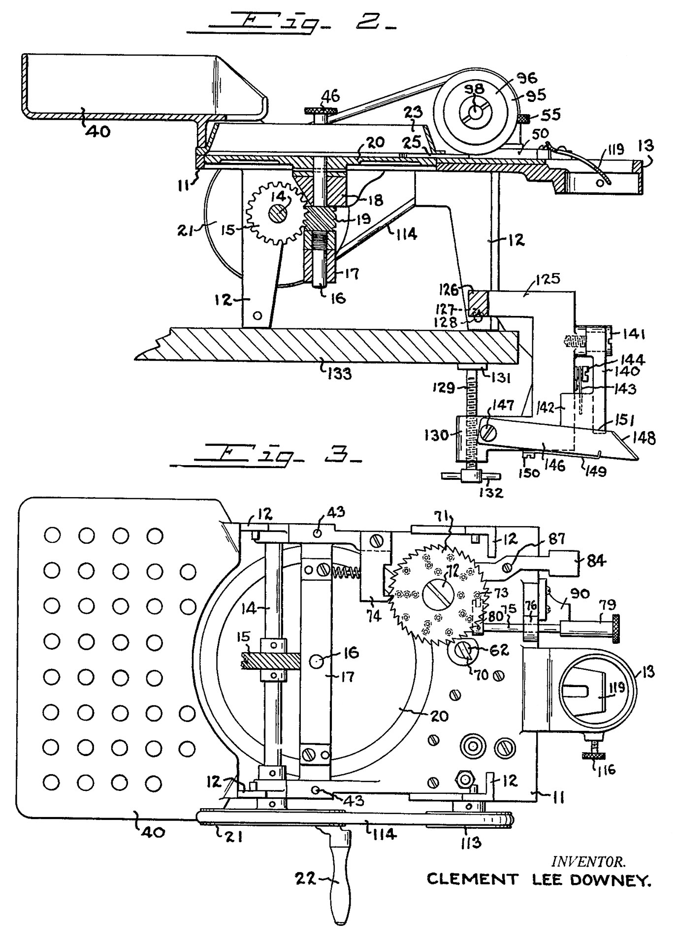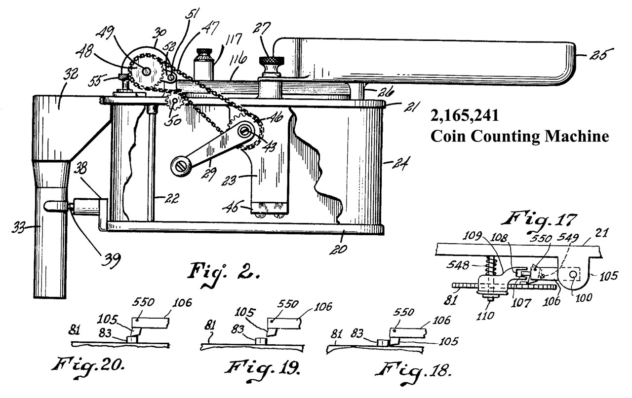 2165240 Coin counting machine, Lee Downey Clement, Filed: May 21, 1932, Pub: Jul 11, 1939, 453/31, 453/35 - hand cranked