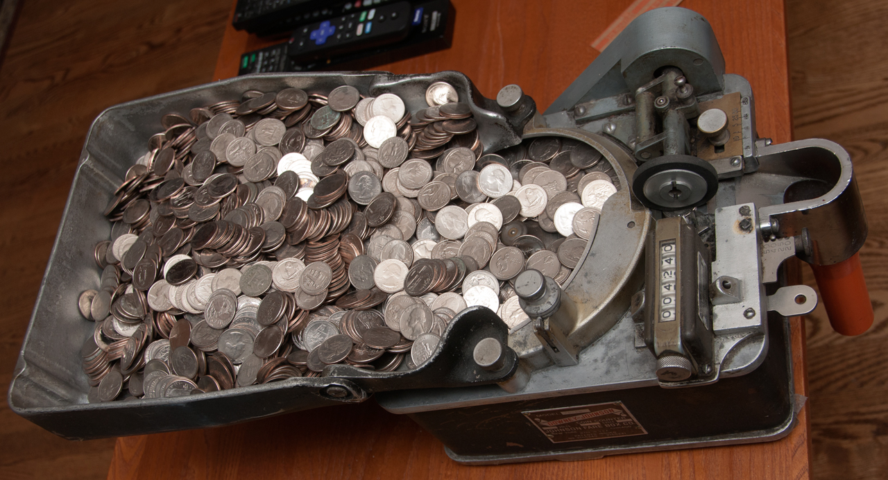The operation of the Veeder Root counter is to count the total number of coins and is independent of the count per roll. This offers a check on the number of coins in a roll. If you zero the counter at the start of a session, when doing quarters, 40 coins per roll, the the count will go 0000, 040, 080, 120, 160, 200, &Etc. When a roll is done the weight should be 8.0 ounces. Quarters and dimes are $20 a pound.