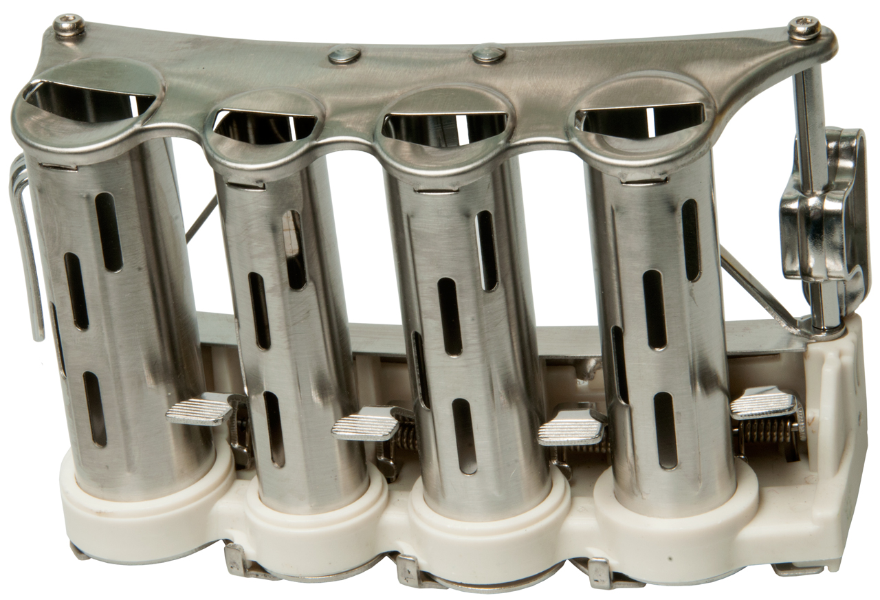 There is a slide at the bottom of the tube that supports the stack of coins. When the slide is moved forward with the hand in a cupped position the stack of coins falls down by 5 coins (25 cents) and is stopped by another slide. When the spring loaded slide is allowed to return to it's resting position 5 coins are dropped into the operator's hand. I think the holes in the tube are at $1 intervals (20 nickles).