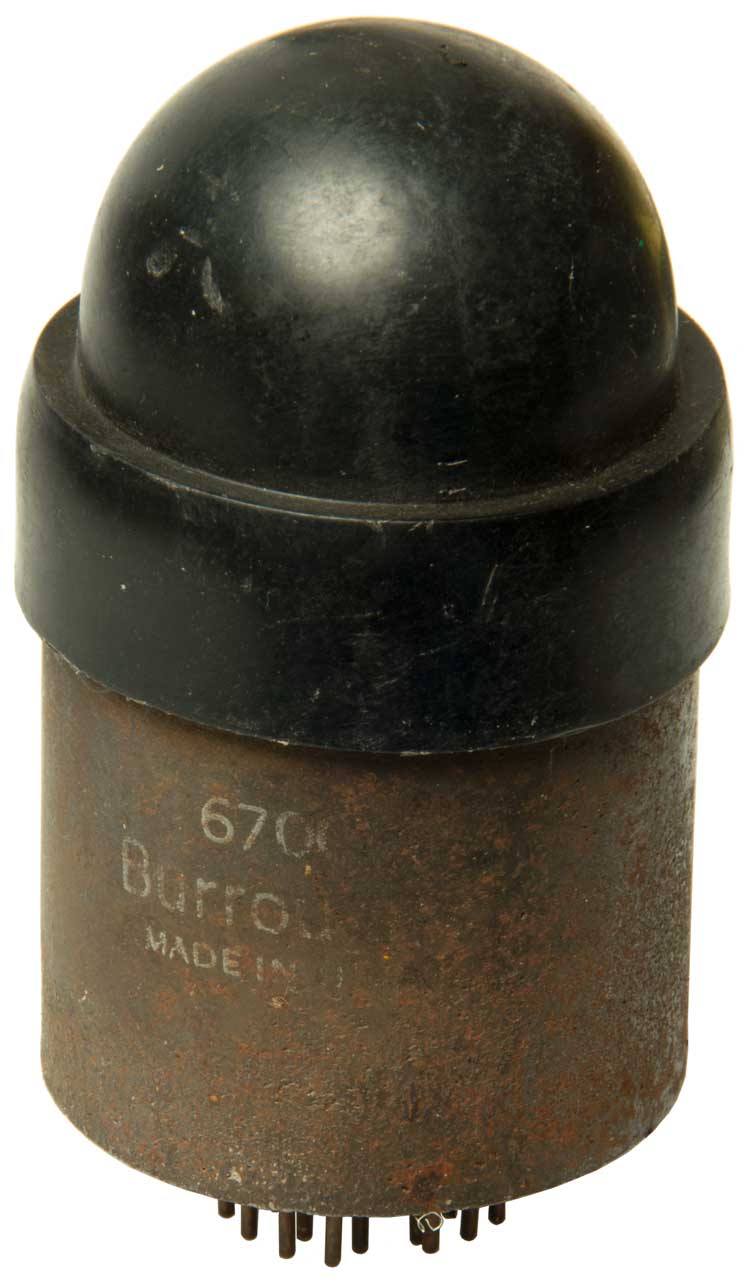 display capability, so is not like a Nixie tube. Burroughs Tube TypesRadio Museum: 6700 - Burroughs Beam-X Tubes BX-1000 - "eliminates 90 transistors, diodes and resistors", 2217774 Electron Discharge Apparatus, A.M. Skellett (Bell Labs), Oct 15 1940 - switching analog circuits using electromagnets to move electron beam aka Trochotron 2293567 Electron dischrage apparatus, Albert M Skellett, Bell Labs, 1942-08-18, - magnetic electron beam steering, Cycloid (Wiki) and Trochoid (Wiki) shaped electron paths. 2513260 Electron discharge apparatus, Alfven Hannes Olof Gosta, Romanus Harald Anton Reinhold, LM Ericsson, 1950-06-27, - selector for multiplex telephone systems 2536150 Electrode system for trochotrons, Backmark Nils Erik Gustav, Jansson Karl Evert Ingemar, Telefonaktiebolaget (Ericsson), 1951-01-02, - 2591997 Electron tube device, Backmark Nils Erik Gustav, LM Ericsson, 1952-04-08, - 2721955 Multiple position beam tube, Fan Sin-Pih, Kuchinsky Saul, Burroughs, 1955-10-25, - copyrighted paper entitled "Multi Output Beam Switching Tubes for Computers and General Purpose Use' presented by Saul Kuchinsky at the March 1953 convention of the Institute of Radio Engineers in New York, N. Y. 2764711 Multiple position beam tube, Kuchinsky Saul, Burroughs Corp, 1956-09-25, - binary weighted outputs. |