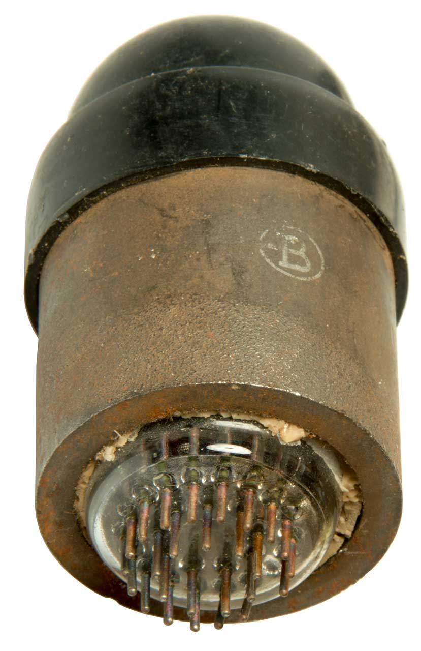 The glass vacuum tube is surrounded by a rusty iron