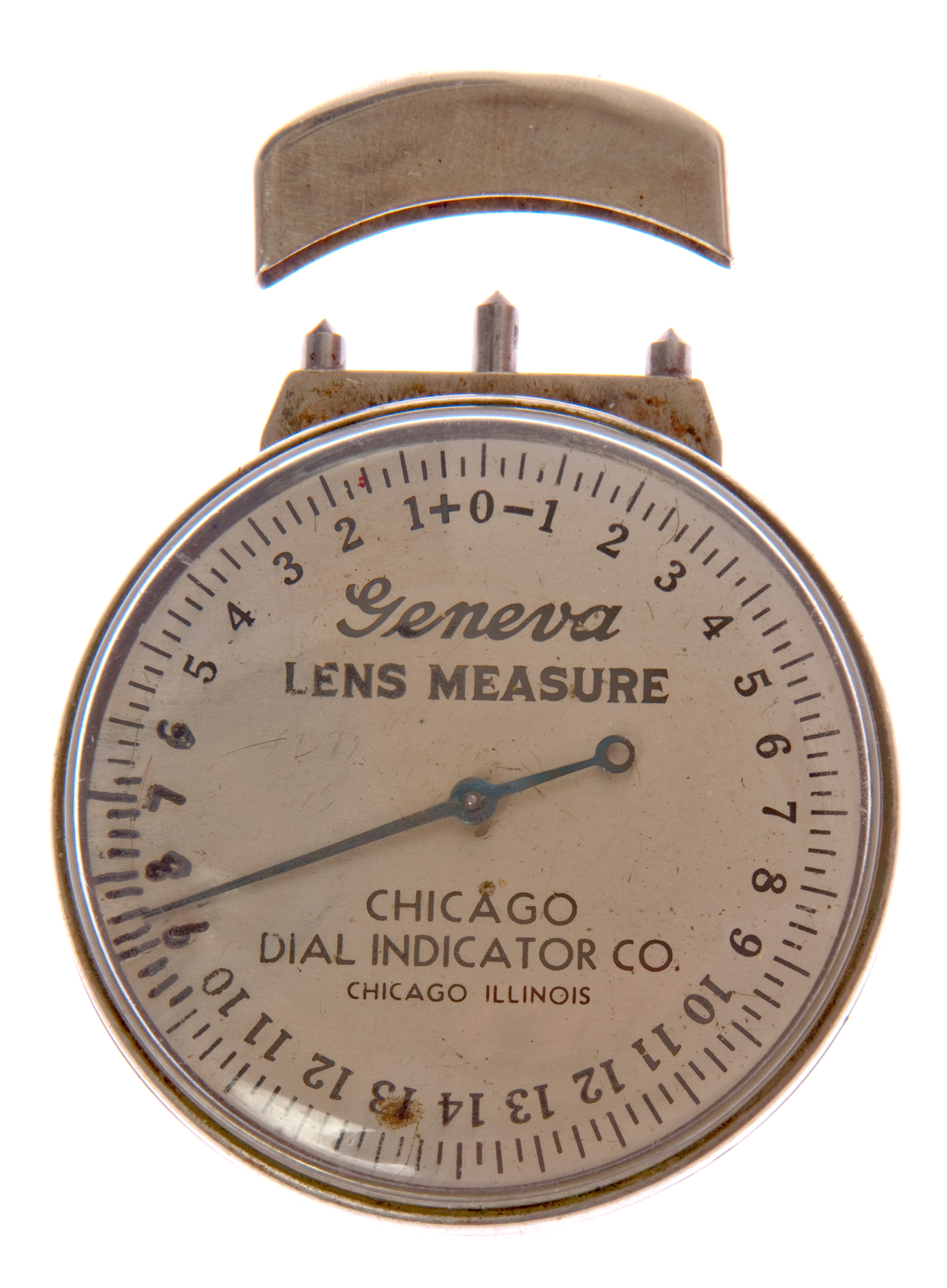 | The generic name: Geneva Lens Measure is on the dial along with the manufacturer's name: Chicago Dial Indicator Co. The hollow sheet metal cap protects the points when the meter is not in use. When the points are placed on a flat surface, such as a 123 block or V Block, the needle turns about 3/4 of a circle and points to 0. So the position of the needle in the photo shows the maximum negative reading it can make of just over -19 dioptre. In a similar manner when the central pin is pressed the maximum indication is about +22 dioptre. The separation of the outer points is 20.61mm It turns out that in order to get the correct dioptre (Wiki) both the curvature of the lens and the refractive index of the lens material need to be known. The Lens Measure actually measures the radius of curvature (positive or negative) and has a built in adjustment for the refractive index of the glass. So when measuring plastic reading glasses or a magnifying glass the displayed result is wrong. Magnifying glass (Wiki) FL = 6.75" (0.171 meters = 5.8 dioptre). Reads +3.2 and +3.2 dioptre (sum = 6.4 off by 0.6). I don't know if the range of adjustment in the Lens Measure is large enough to include the refractive index of plastic. The Wiki Lens Clock web page explains how to convert the reading when the refractive index (Wiki) is different from the factory set value of 1.523 (crown flint glass). |