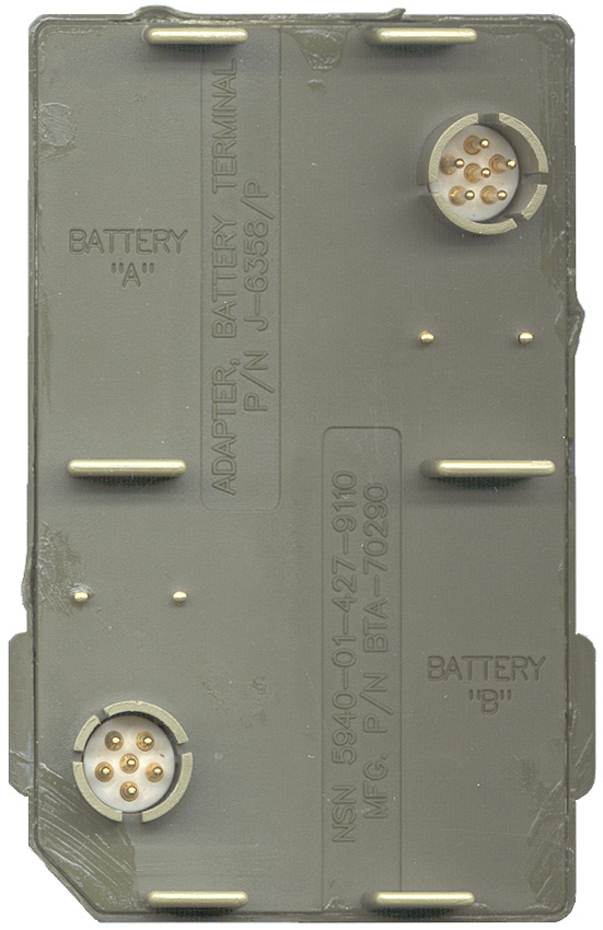 An adapter is used to connect the batteries to be charged to the PP-8444A/U. There are different adapters for different rechargeable batteries. The adapter has a Cinch Jones 18 pin plug that mates with the charger and has receptacles on top to hold two batteries..