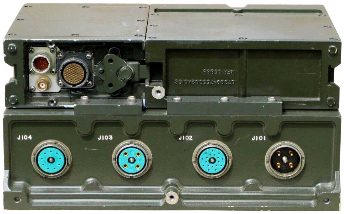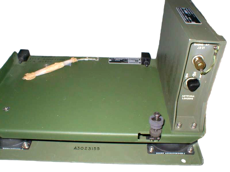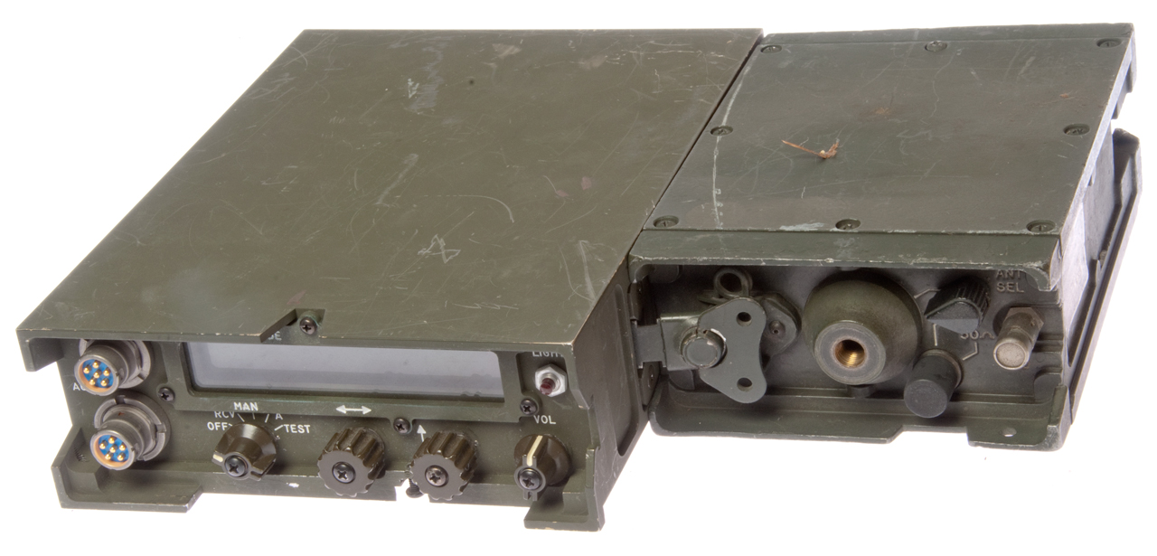 This is a combined RT-1209 and the RT-1444 all in one box so on one side it has the connector to go to the RF Amp and on the other side the connector for the URC-113/GRC-206. It has the same battery box connector on the bottom to make a PRC-104 manpack radio.