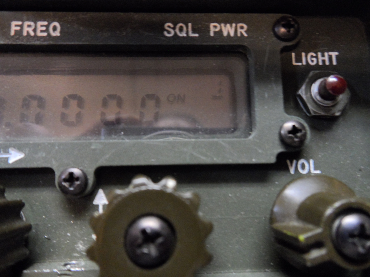 LCD with labels a top: VOL, MODE, FREQ, SQL, PWR