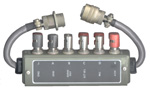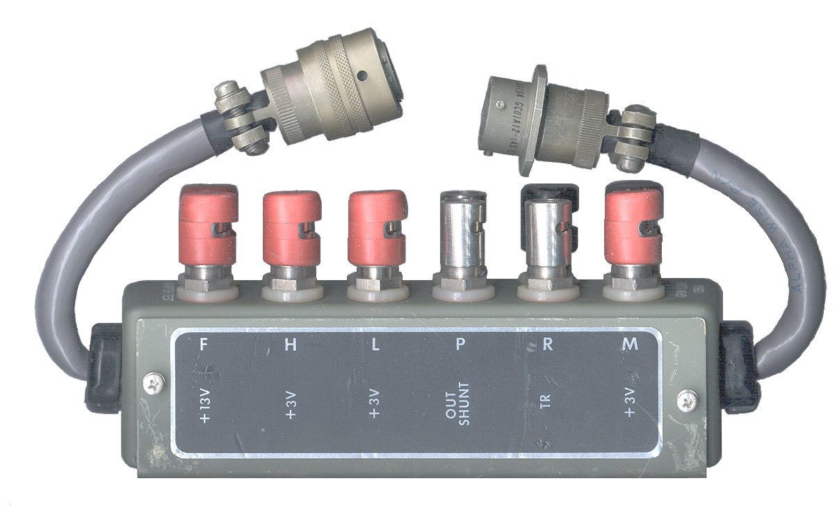 This test adatper connects to the "POWER" connector on the PRC-25, PRC-77, X-mode on the VRC-12 series radios and the Tx/Rx & REMOTE MSC-2001 plus other things. It has 12 each spring clip binding posts that connect to the corresponding contacts. The male connector that mates to the radio is marked 9215 ACCPW06B12-14P and has 14 Pins. The female connector, like the one on the radio is marked 30194 GC01A12-14S and has 14 sockets.