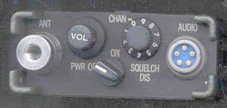 Name Photo Description ANT connector Top Connects antenna (or 50 Ohm cable using 914598-801 adapter or 68AA) . CHAN selector switch Top Selects one of 10 preset operating channels. OFF/ON/SQUELCH DIS switch Top Turns radio set on (clockwise) or off (full counterclockwise).