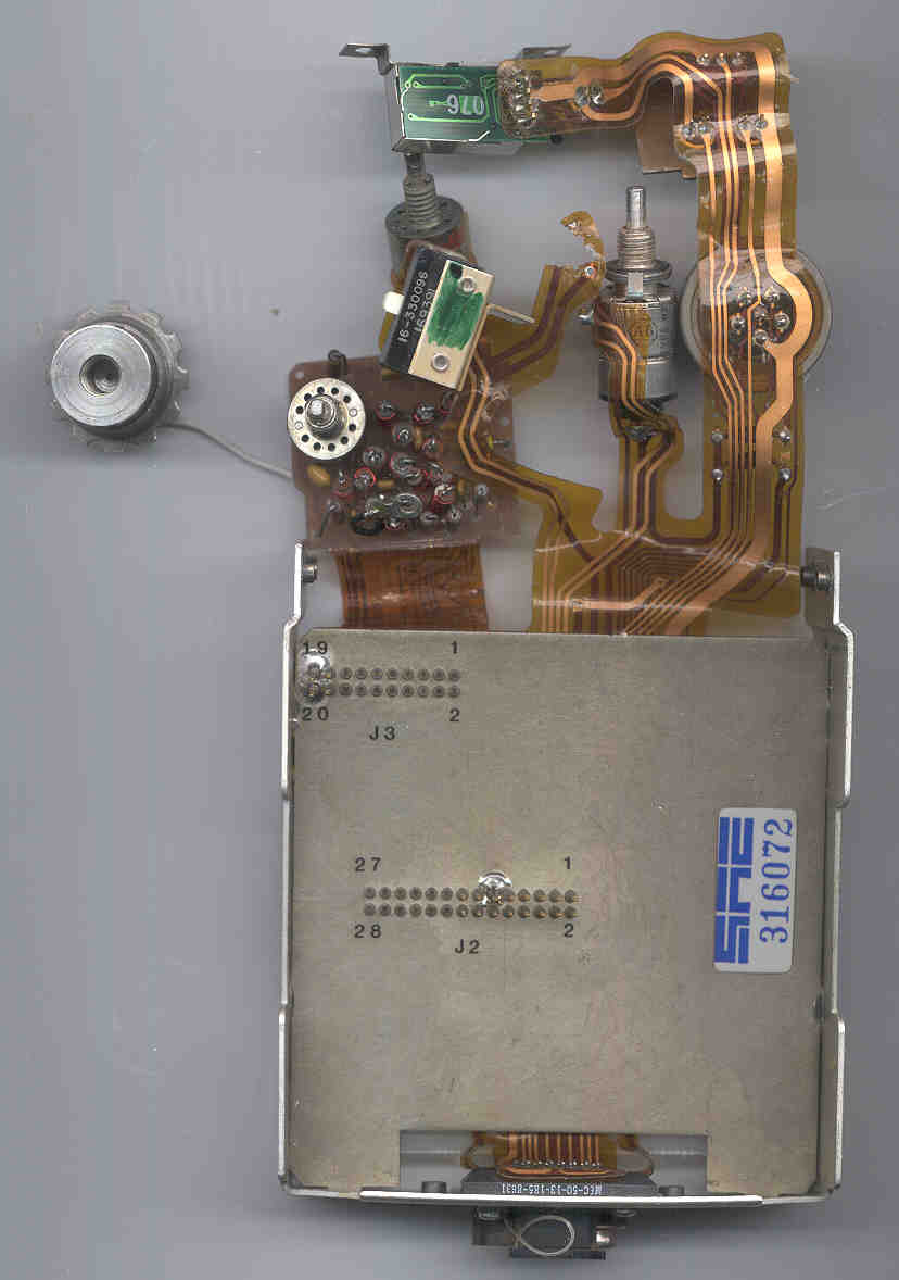 The SPKR/MIC can be left in the panel, or to remove it, take off the 4 screws that are normally visible and the Aluminum plate behind the grill then lift it out.The ANT switch is mounted on a board that contains the antenna matching circuitry that is mostly composed of inductors and capacitors. The flex circuit traces from this matching circuit go to the J3 connector. A white wire from this board goes to the ANT connector.
