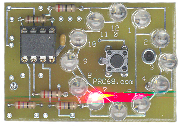 - The PCB layout is based on using an 18 pin PIC like the 16F84 that the above assembly code was written for, but comes with a different PIC in a socket. So if you want to try your own code to do different things it's easy to change micro controllers.