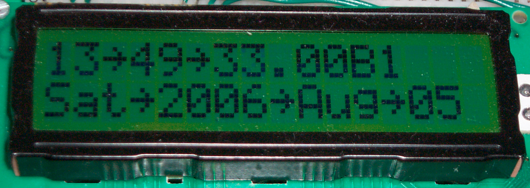 7 July 2006 - The 16x2 Display (top of photo) that's targeted for the PC3 has much larger characters than the 4x20 (bottom of photo). The 16x2 is being driven from a 16F88 using new LCD driver subroutines taken from the PIC Demo2 software package and the 20x4 is driven from a 16F676. These drivers read and write a bit at a time to control the LCD and in that way do not disturb the other bits on the port that are doing other things. But still not using the Linker software, just one assembly source file.