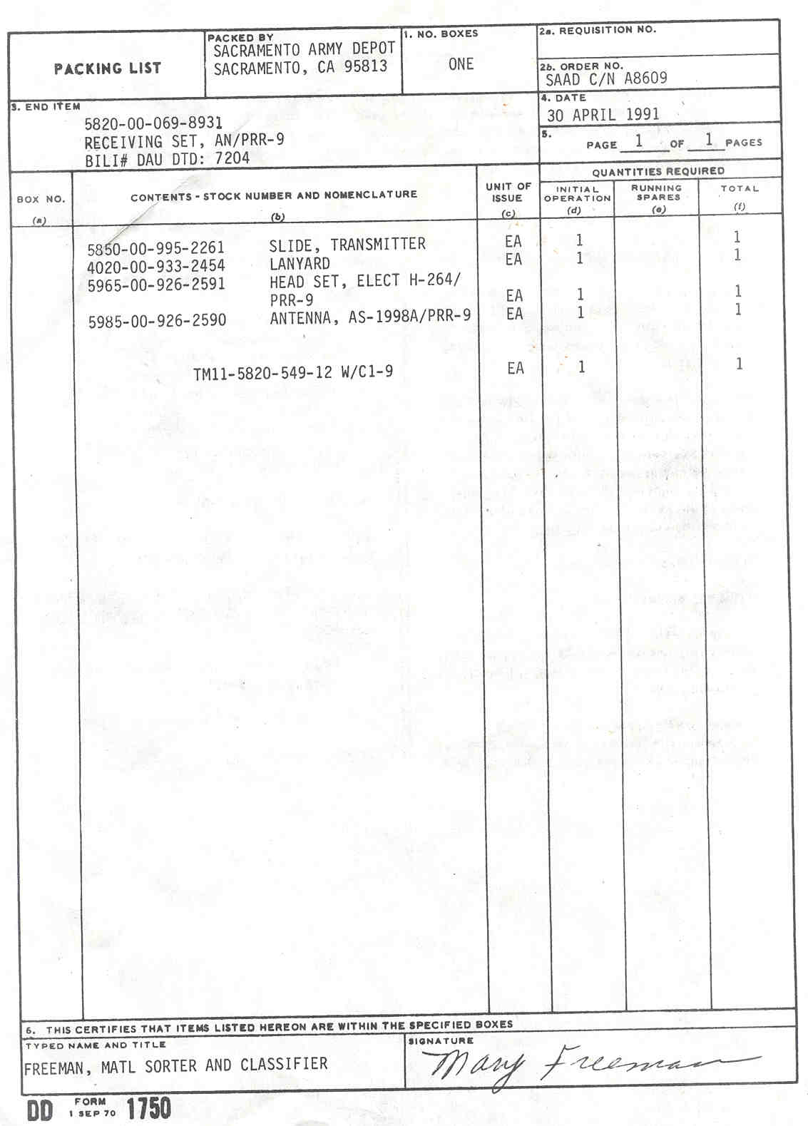 Overhauled 1991 - Label -Lanyard - NSN 5985-00-933-2454 Slide - NSN 5820-00-995-2261 AS-1999/PRT-4 Antenna - NSN 5985-00-926-2589 CY-6115/PRT-4 Battery Case - NSN 6130-00-908-9189