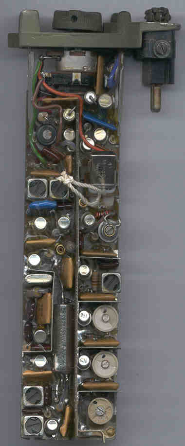 The crystal is on the right just above the pull string. The other crystal on the left is soldered in and is not the one to change freq. The large tubular device in the lower center is a ceramic filter. The metal "S" shape pointing down in the lower right corner is the contact for the antenna.The crystal is marked 40.300000 and corresponds to a Rx freq of 51.0 MHz. (Rx freq = Xtal Freq + 10.7 MHz)