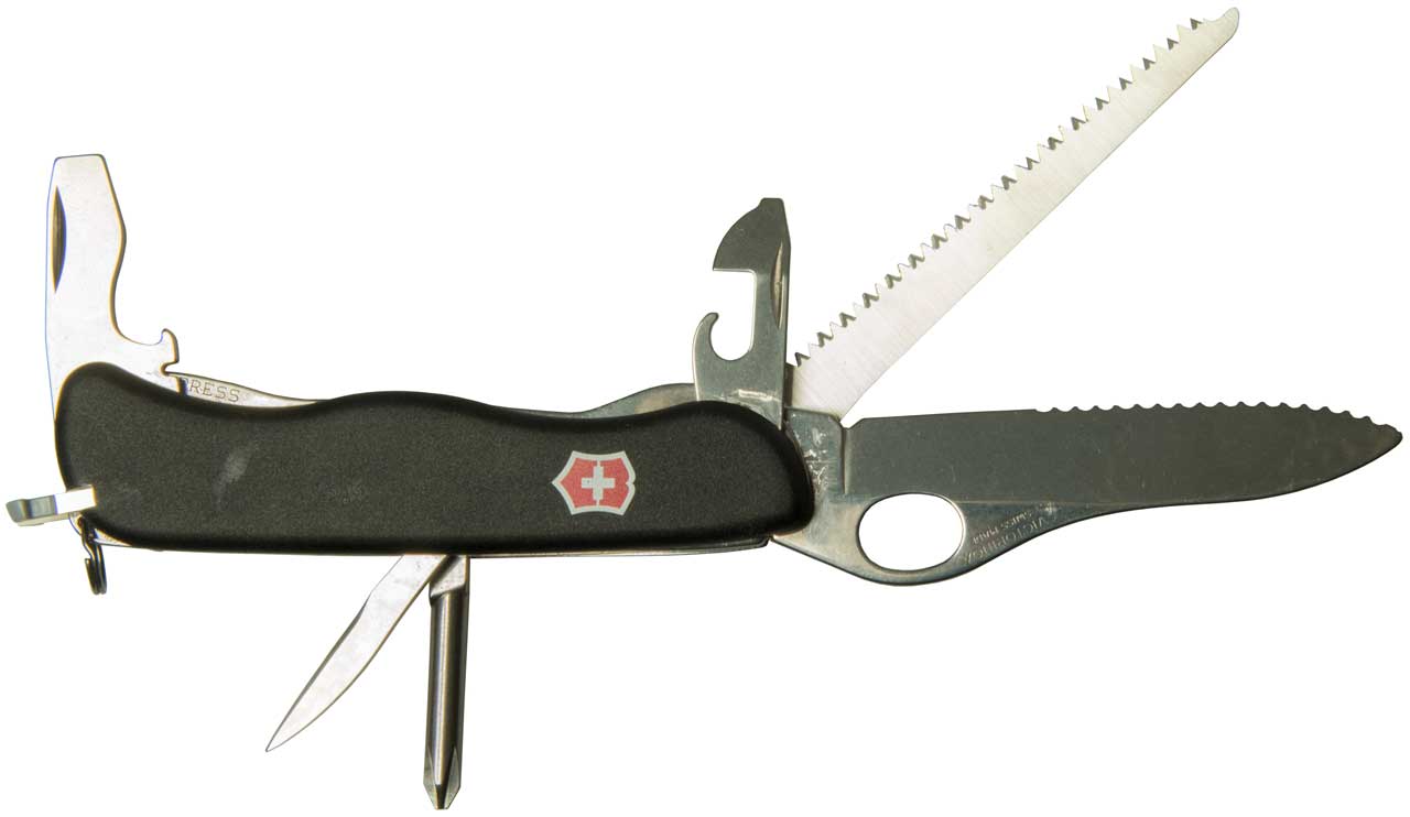 Tools: Blade, large with wavy edge / Can opener | Screwdriver 3 mm / Bottle opener, lockable | Screwdriver 7 mm | Wire stripper / Reamer, punch / Wood saw / Phillips screwdriver 1/2 / Key ring / Can opener / Bottle opener, lockable