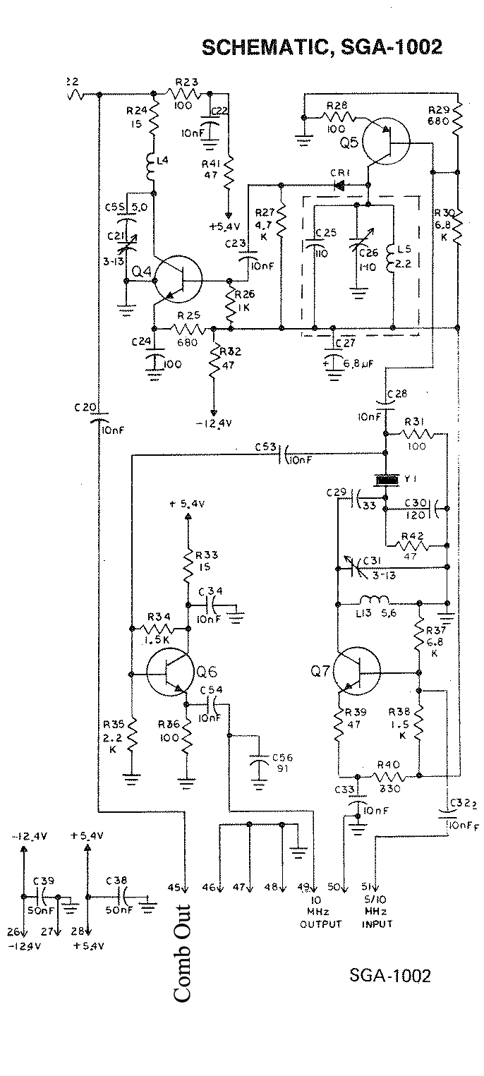 MHz oscillator part)![]() Q5 and Q4 are the comb generator who's output is at the junction of R22, R23 & R24. Q6 is a buffer amp for the 10 MHz output. Q7 is the 10 Mz oscillator and acts as a doubler if the input is 5 MHz. |