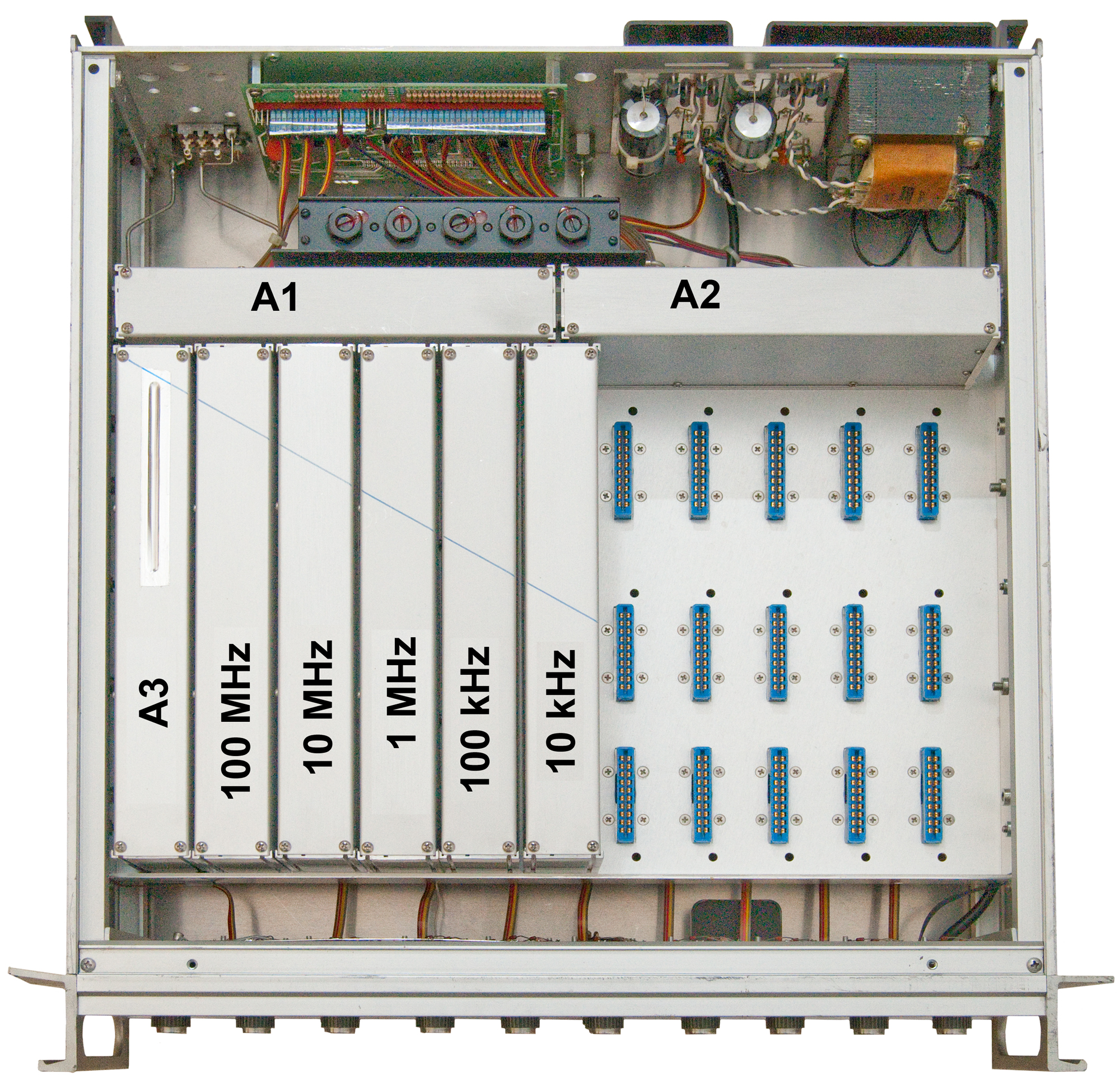Fig 2 Top Inside A1 is the Output Amp (OA)A2 is the Intermediate Mixer (IM) module A3 is the Step Oscillator (SO) module 100 MHz is really the SGA 10 MHz is really the SGB 1 MHz is the DMA 100 kHz and 10 kHz are DM modules More DM modules could be added to get finer frequency steps. |