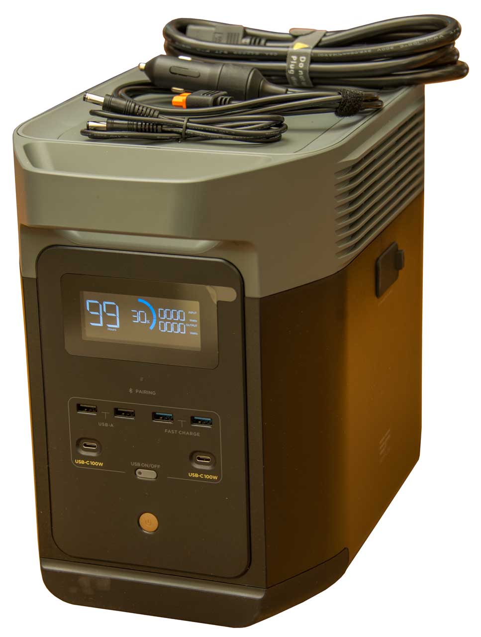 A LiFePo4 Battery rated 1024 Watt hours is the heart of this unit. It has various 120 VAC and 12 VDC& 5 VDC outputs. The input to charge the battery can either be 120 VAC up to 1200 Watts or 11 to 60 VDC, 15 Amps max, 500 Watts max. driving an internal MPPT (Wiki) charge controller.