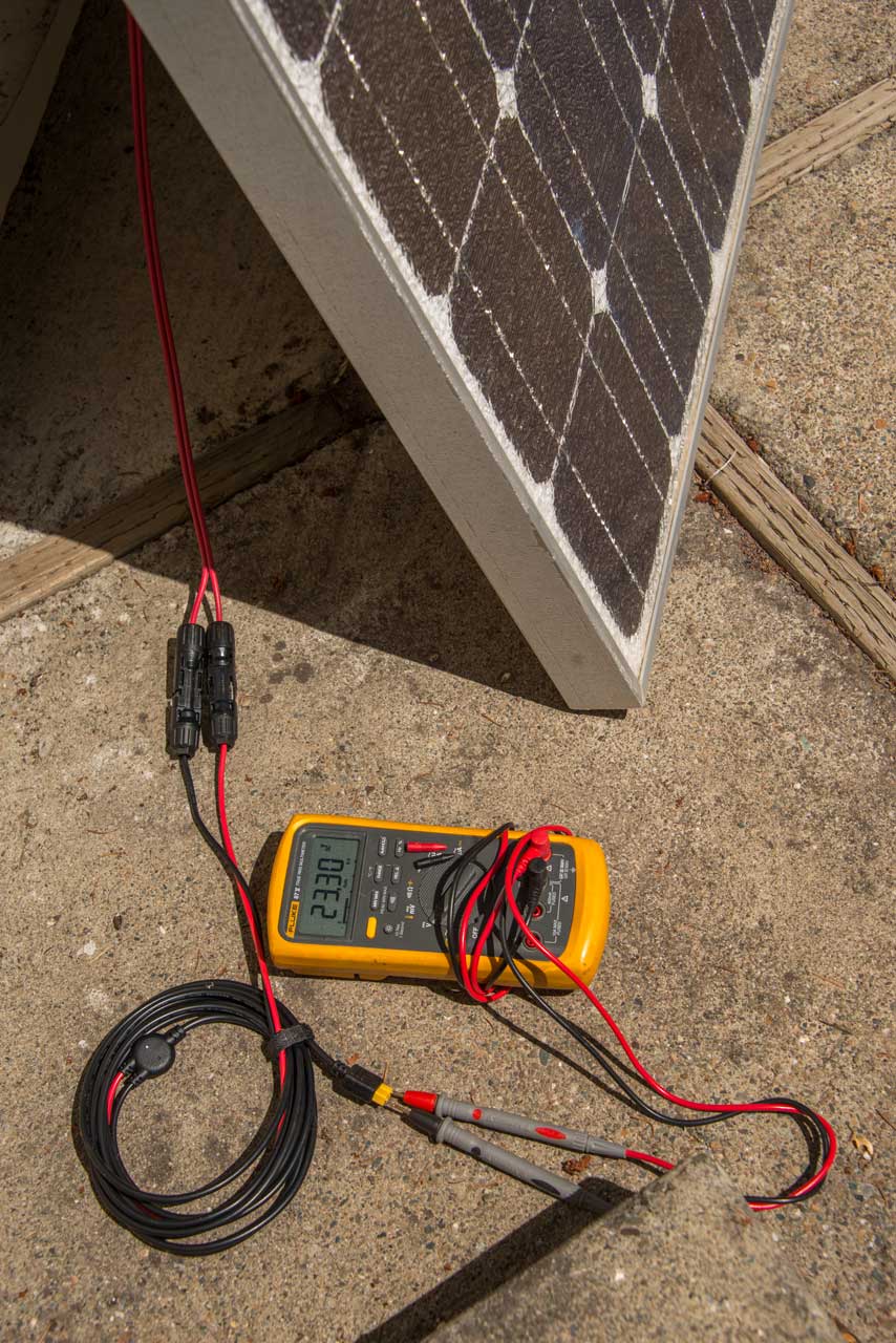 In Fig 5 the DMM is not showing a negative sign (i.e. the red lead is positive). The red lead is going to the rounded end of the yellow XT60 connector which should be negative. So something is wrong with the cabling. The solar panel has a Power Pole connector with red being positive (see the grid intertie photo at SMIC). The EcoFlow MC4 to XT60 cable is wired as shown on the DIY Instructin card that came with the Delta 2. BUT . . the Power Pole to MC4 cable looks like it has reversed polarity.
