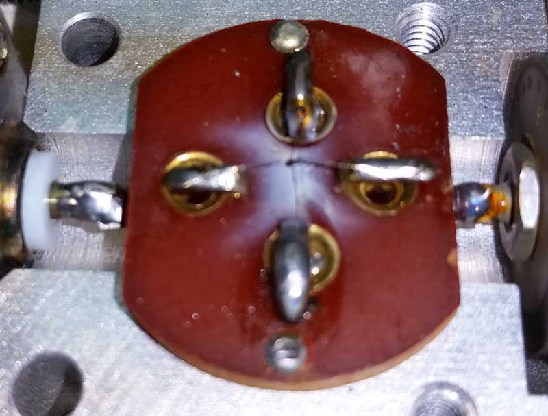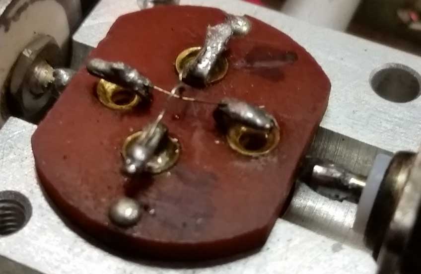 Instead of a thermocouple this version uses a simple resistor divider circuit. The oscillator signal goes through three parallel 2.7 Ohm resistors (0.9 Ohms) then to the Lo Coil terminal. From the Lo Coil terminal to ground is a 0.03 Ohm resistor. The Vacuum Tube Voltmeter (VTVM) is connected to the Oscillator.
