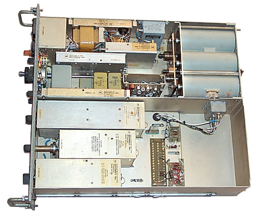 This is a 5" high rack mount Military UHF radio receiver made by Motorola for the Air Force. All connections are on the front panel. The 19 pin connector is labeled 120/208 Volts, 400 CPS, 3 Phase 4 wire. My plan was to replace the 400 Hz supply with a 60 Hz Power Supply brick which would fit in the right rear empty space behind the three synthesizer modules. Never did make the conversion.The synthesized tuning covers from 220.00 to 399.95 MHz. In addition there is a triple cavity preselector that is tuned by the manual geared tuning knob whose dial is calibrated with 5 MHz ticks. This receiver was designed to work with a transmitter very close by. Solid state construction using mostly discrete components (the golden age of surplus) should make it repairable.