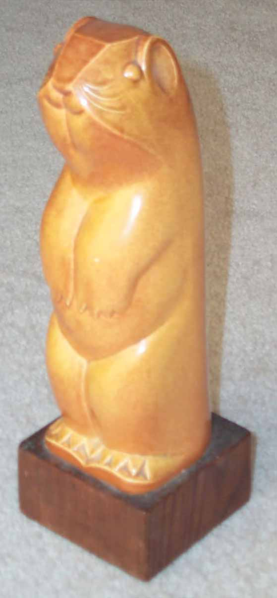 When I reglued the ceramic part to the wooden base I could see that the thickness is about 1/4 to 1/2" and this is a slip casting. Other copies of this prairie dog must have been made.