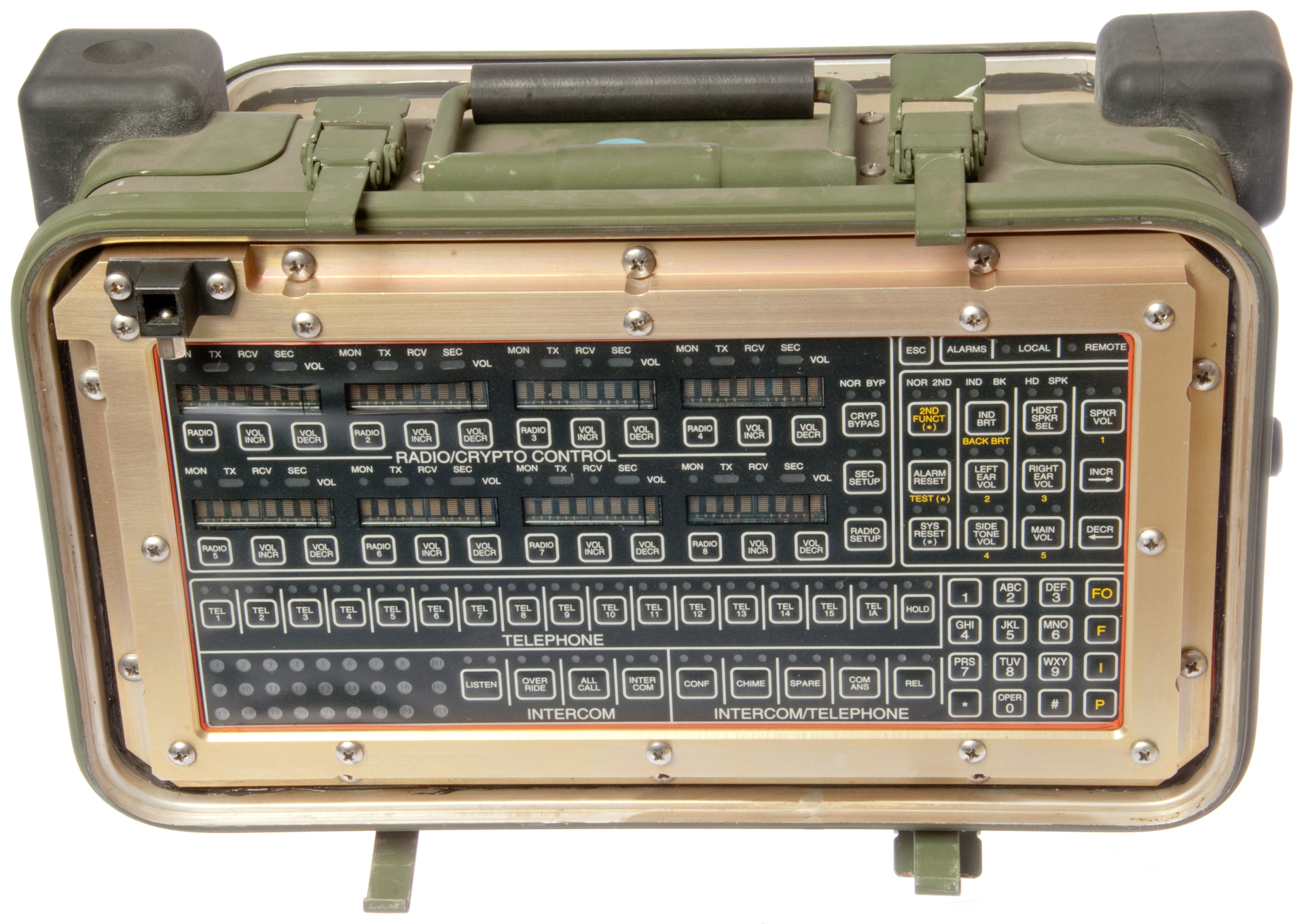 The C-11166/GRC-206 Universal Radio System Control URSC communicates with the MT-6250 rack mount holding 4 radios and their associated cryptographic equipment by means of a fiber optic cable with 2 bundles, one for each direction of data travel. The other end of the fiber optic cable goes to the C11169/GRC-206 Signal Distribution Unit SDU which in turn uses regular electrical cables to interface with the radios. The C-11166 remote is laid out with the idea that there will be two operators using it at the same time.
