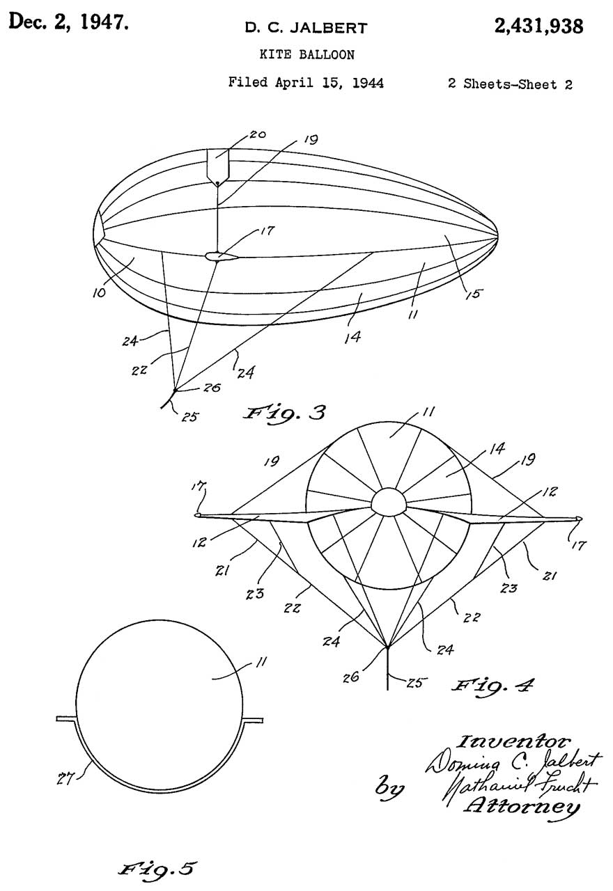 2431938 Kite balloon, Domina C Jalbert, App: 1944-04-15, W.W.II, Pub: 1947-12-02, - Kytoon