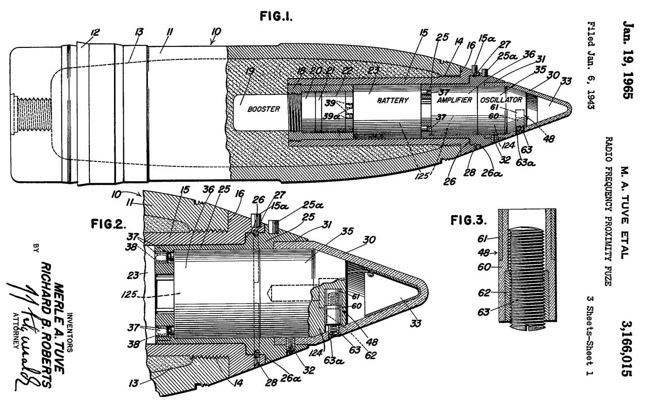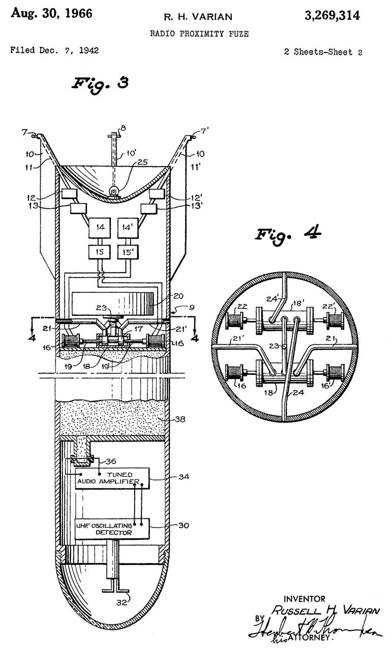 3269314 Radio proximity fuze, Russell H Varian, Sperry, App: 1941-07-08, TOP SECRET 25 years, Pub: 1966-08-30, -