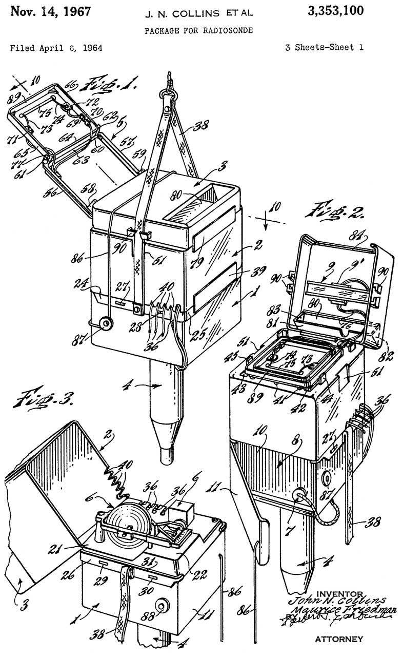 2746035 Radar reflector, Virginia T Norwood (Wiki), Army, 1956-05-15, 342/7 - "In order to utilize fully, all of the reflective corners, the reflector should be permitted to rotate or tumble freely in all directions. This can be accomplished by providing gimbals 12 or universal joints..." - designed for weather balloons and resulted in discovering high-altitude winds.