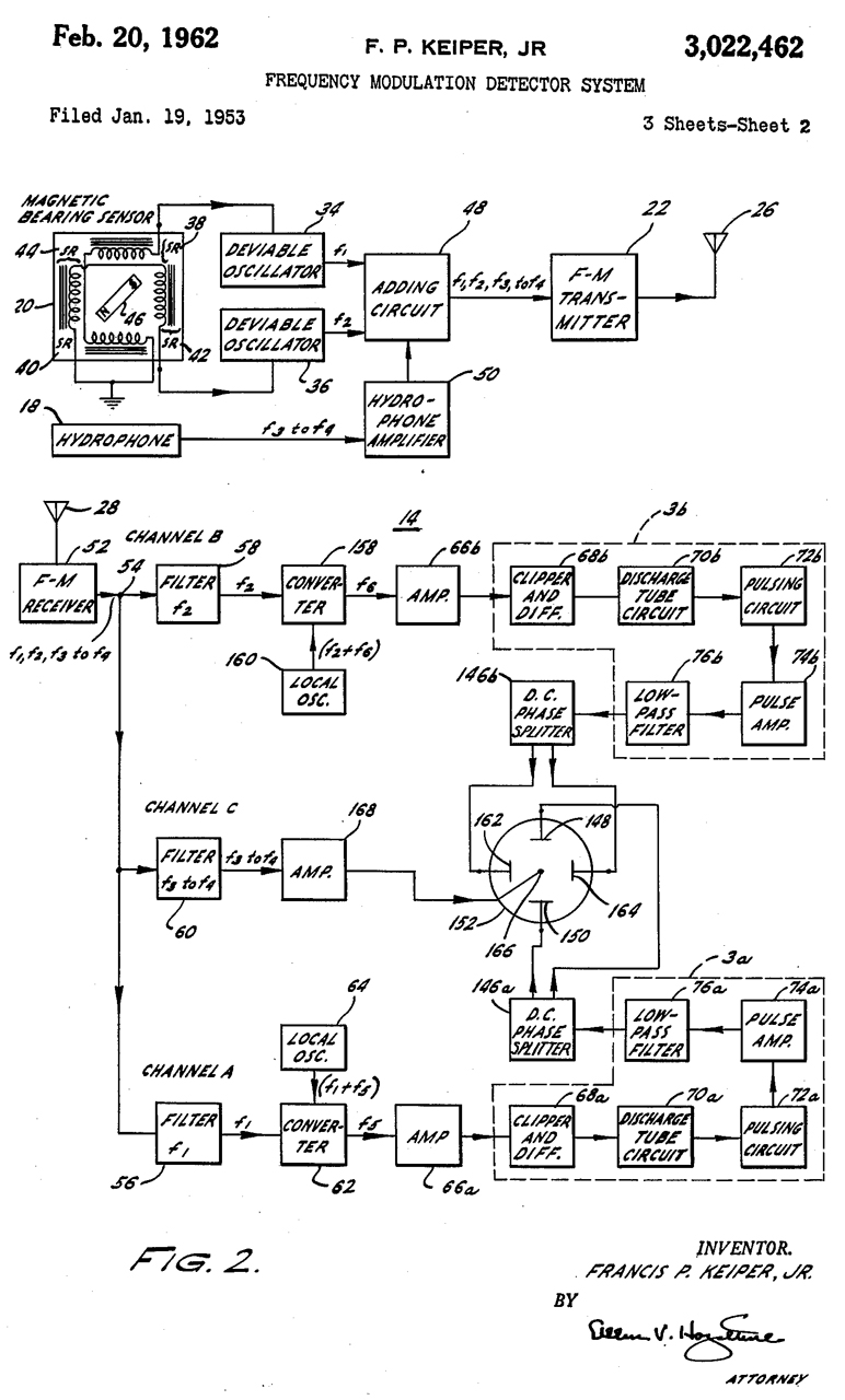 3541451 Variable center frequency filter for frequency modulation receiver, Laurel R Lind, Magnavox,1970-11-17, - 10.7 MHz + or - 0.1MHz linked to AFC - sounds like DIFAR Rx