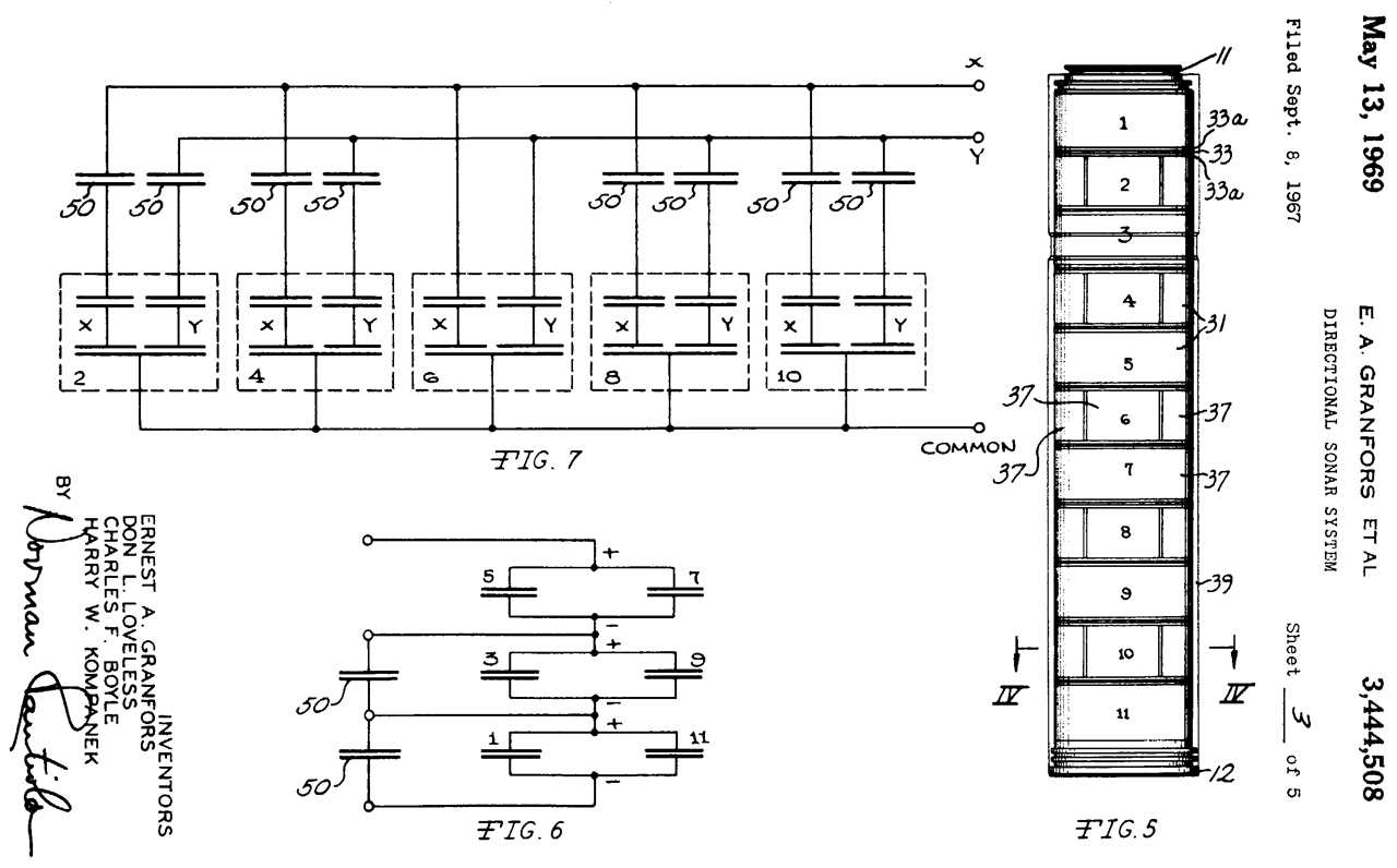 3584243 Acoustic transducer, Everett L Fabian, Acoustic transducer, Everett L Fabian, Magnavox,1971-06-08, - piezo hydrophone N-S shear at one end and E-W shear at the other end - sounds like a DIFAR hydrophone, 20 Hz to 5 kHz,