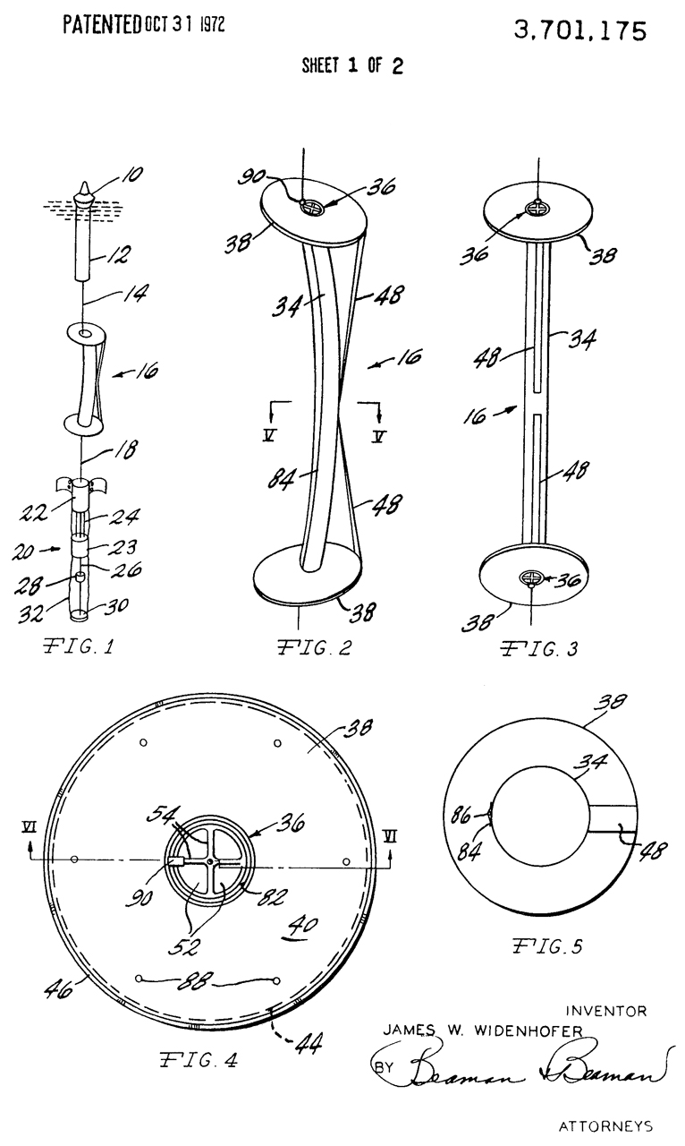 This page was started as a direct result of seeing a YouTube video by FixitFrank titled: "SS-Q53A Hydrophone Sonobuoy Teardown Part 1". In addition Frank let me know the patent numbers 4029233 & 3921120 that appear on a metal plate that's part of the parachute-float assembly. These, and the patents on my Sonobuoy web page led to the patents below.