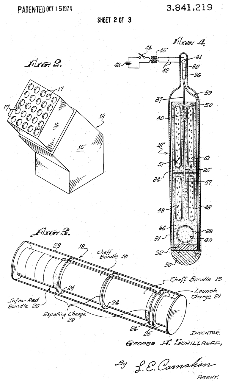 5117731 Tactical acoustic decoy, Mark A. Mendenhall, Secretary Of The Navy, Jun 2, 1992, 89/1.816, 102/348, 367/1, 102/501 - mounts on ship and jams infrared, sonar & microwave. sounds very similar to 4194246 above.