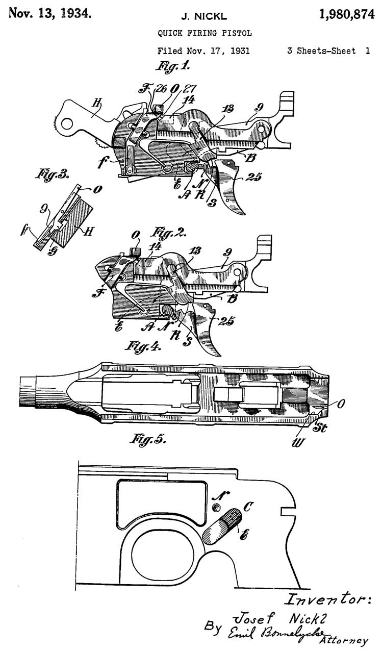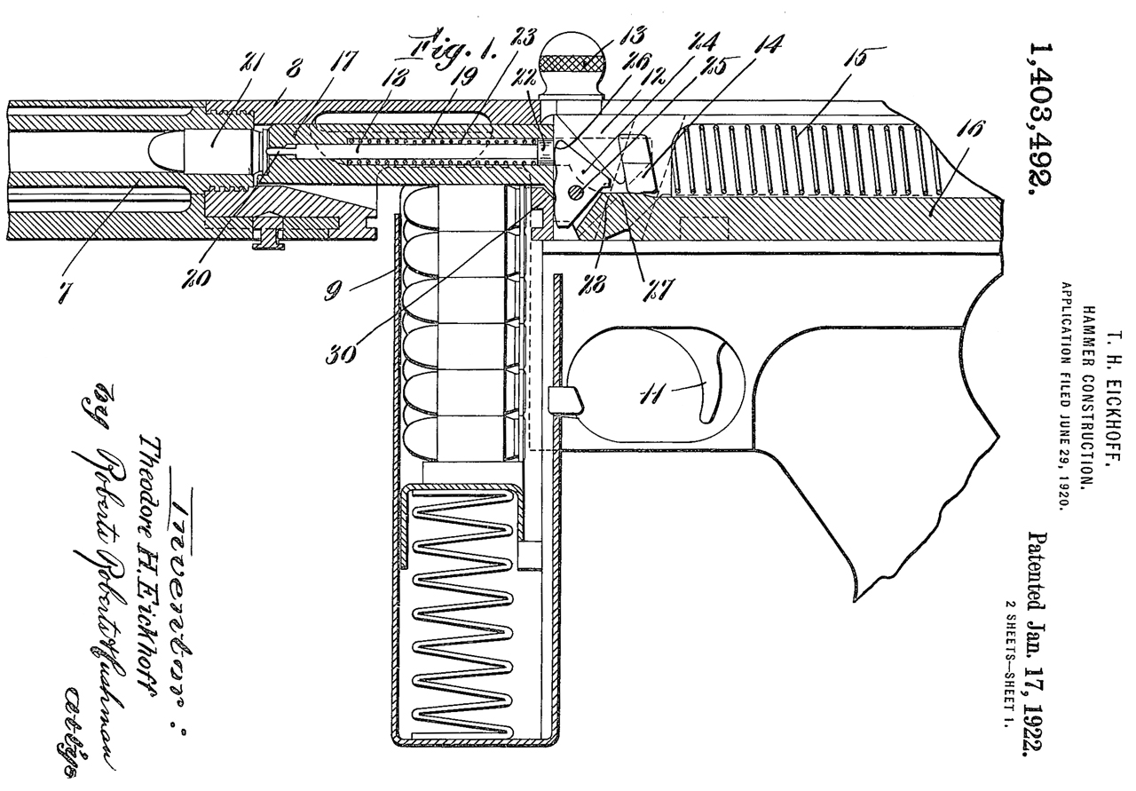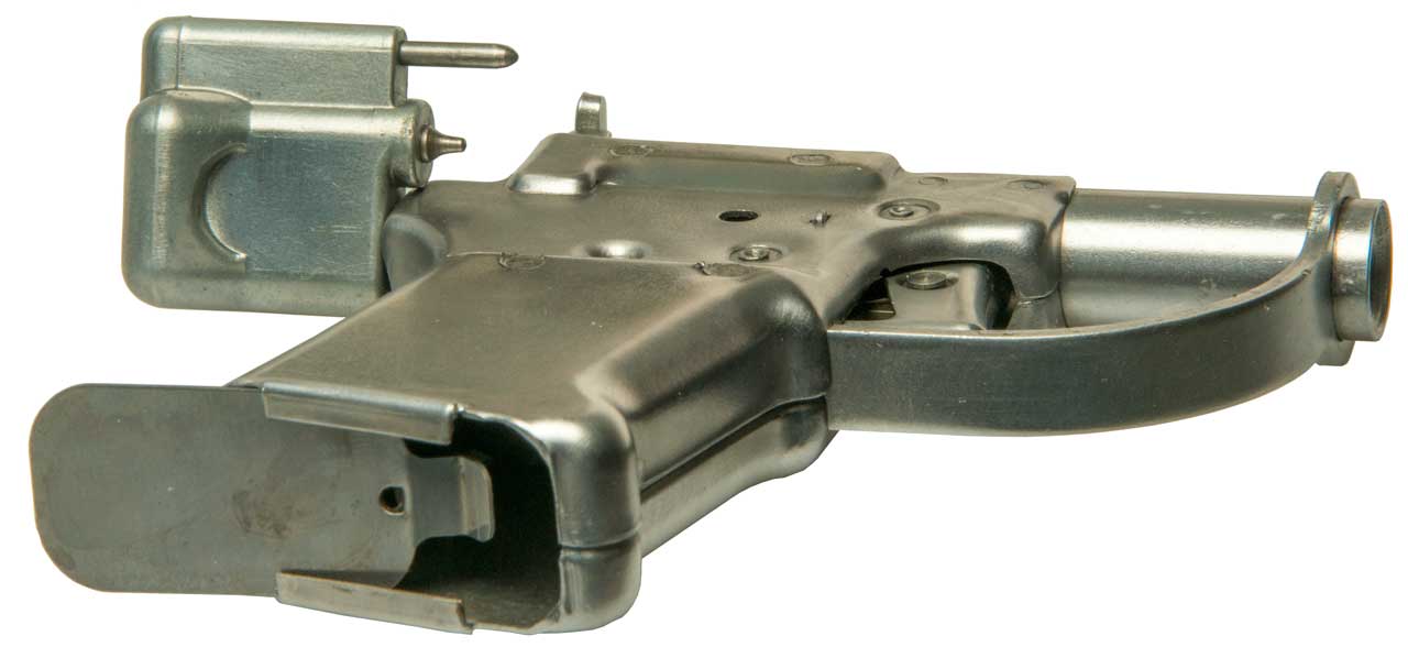 2655839 Blowback autoloading pistol, William B Ruger, Sturm Ruger and Co, App: 1946-11-05, Pub: 1953-10-20, - cleaver use of sheet metal and cylindrical shapes to lower cost. Uses some ideas from the M3 Grease Gun,